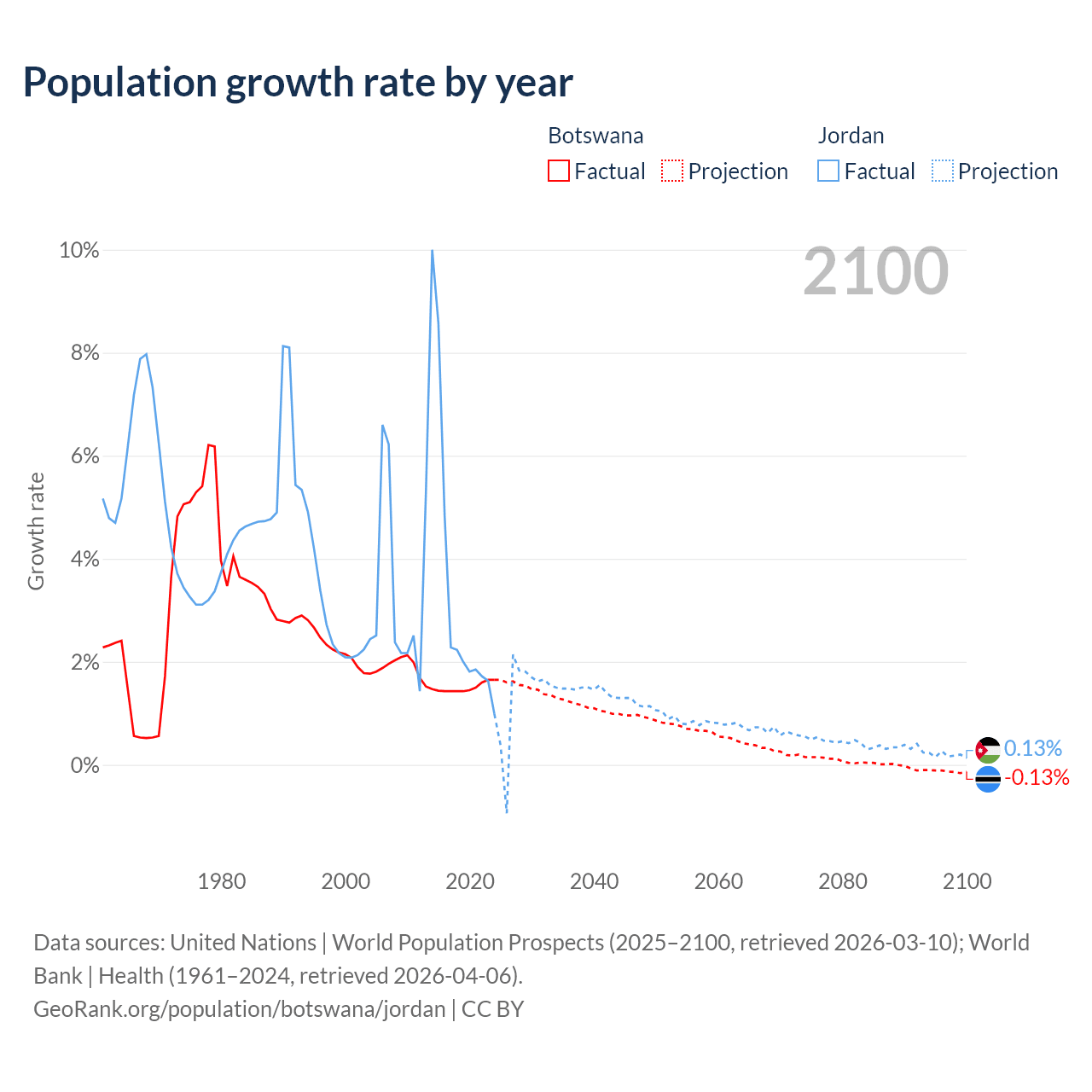 - For the last 10 years, Botswana has had an average growth rate of +1.5% per year vs +3.45% in Jordan.