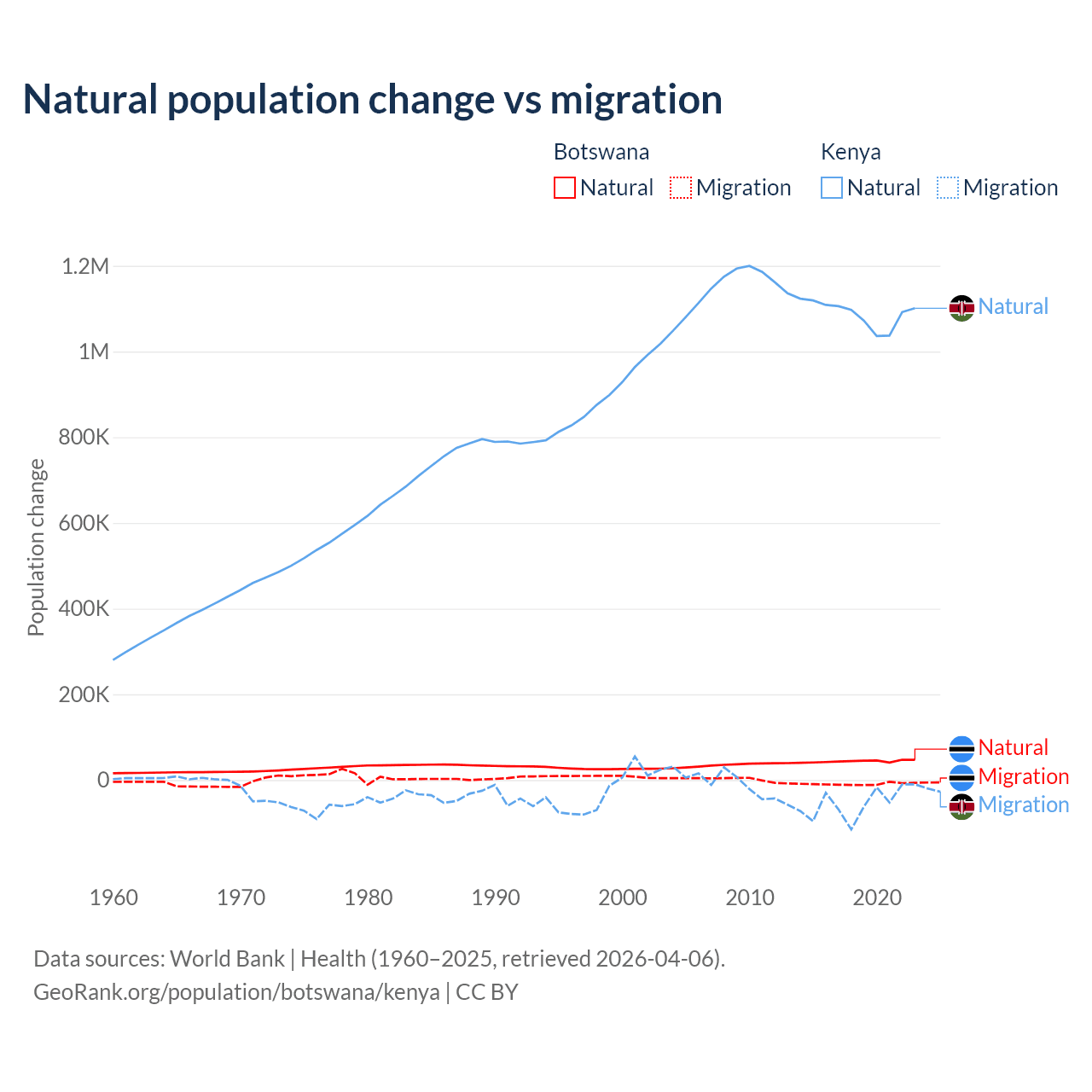 Over the last 10 years, 82.5% of the population change in Botswana is from natural causes (a gain of 436,373 people) and 17.5% is from migration (a loss of 92,293 people). In Kenya 95.3% is from natural causes (a gain of 10,892,362 people) and 4.67% is from migration (a loss of 533,876 people).