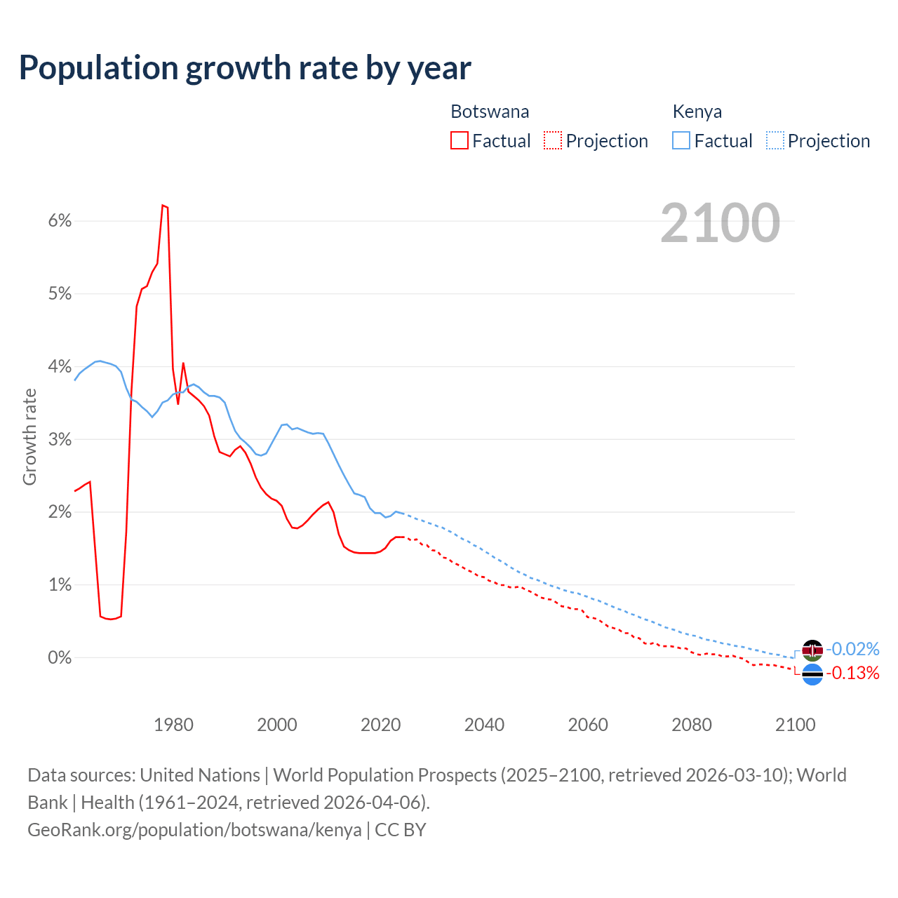 Botswana vs Kenya: population by year and forecast