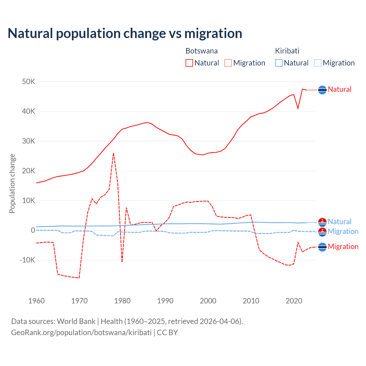 Over the last 10 years, 82.5% of the population change in Botswana is from natural causes (a gain of 436,373 people) and 17.5% is from migration (a loss of 92,293 people). In Kiribati 80% is from natural causes (a gain of 25,262 people) and 20% is from migration (a loss of 6,330 people).