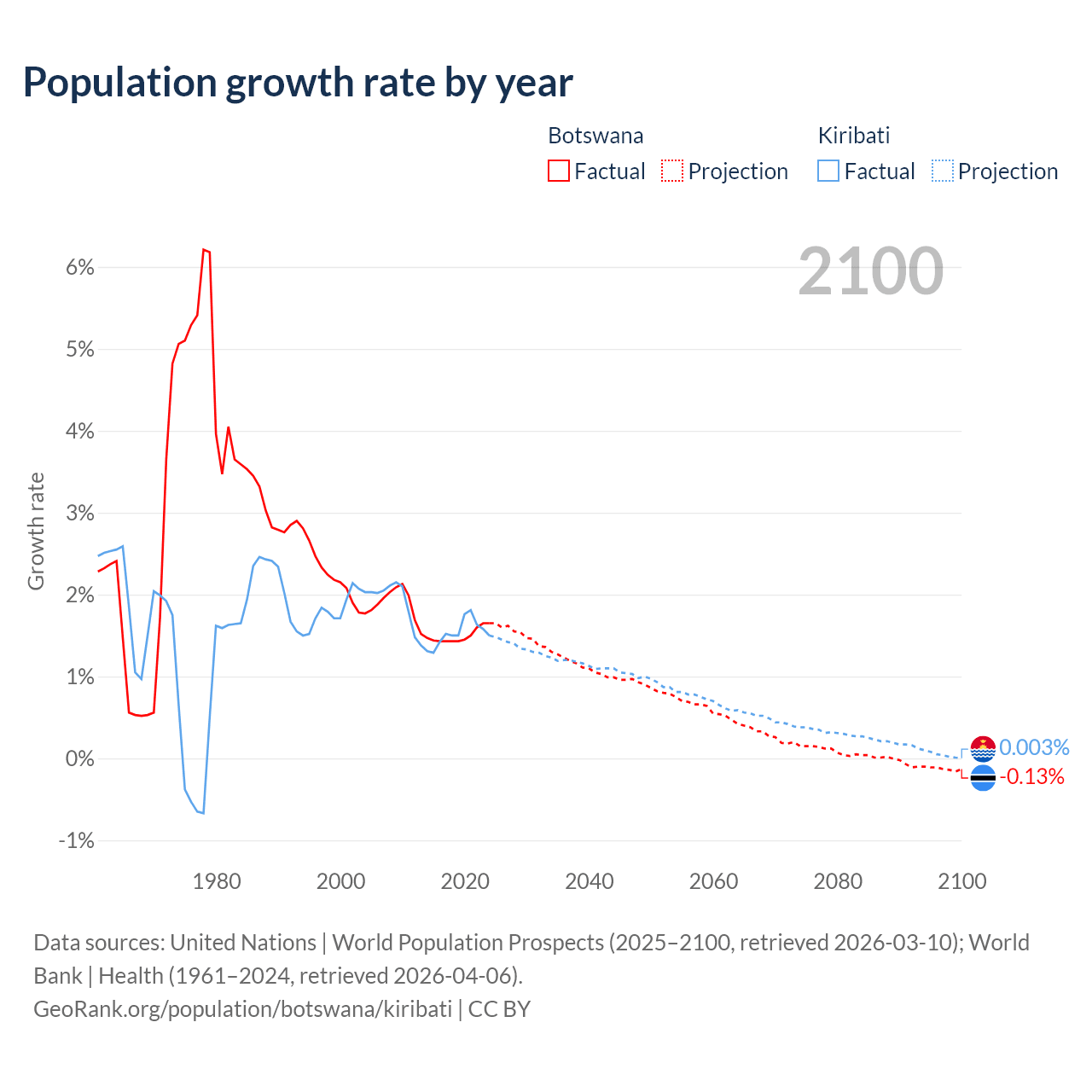 - For the last 10 years, Botswana has had an average growth rate of +1.5% per year vs +1.53% in Kiribati.