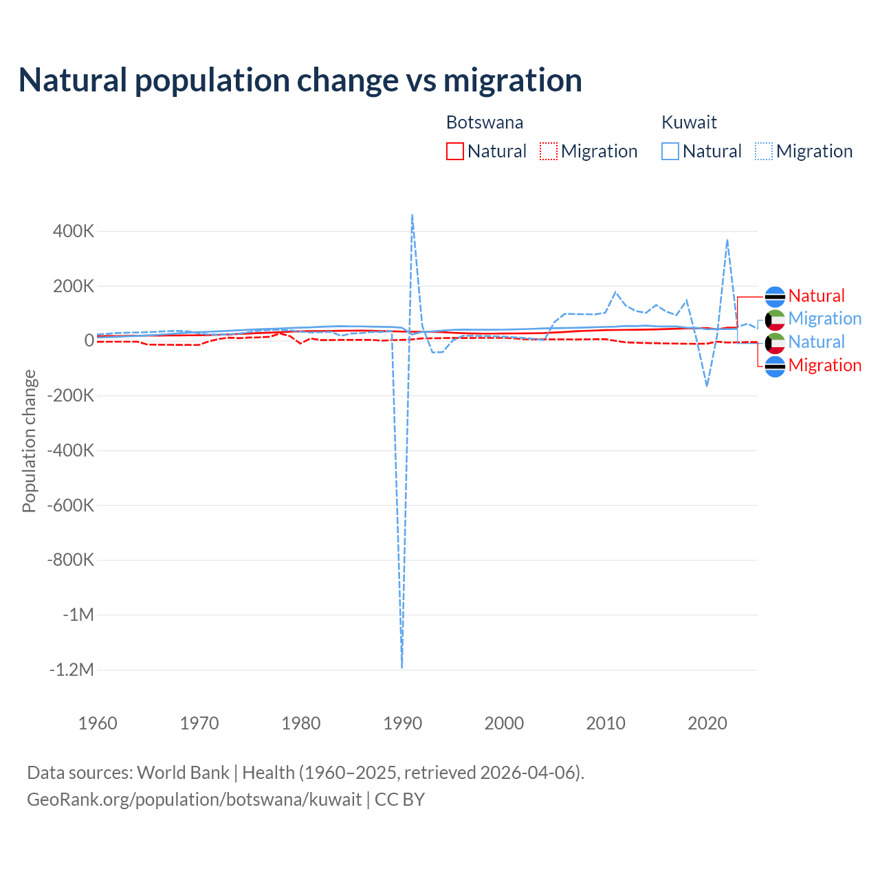 Over the last 10 years, 82.5% of the population change in Botswana is from natural causes (a gain of 436,373 people) and 17.5% is from migration (a loss of 92,293 people). In Kuwait 35.8% is from natural causes (a gain of 470,645 people) and 64.2% is from migration (a gain of 845,142 people).