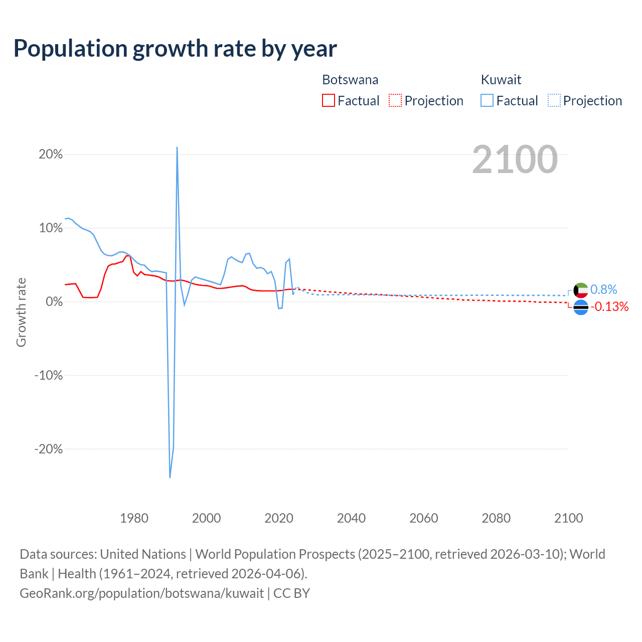 - For the last 10 years, Botswana has had an average growth rate of +1.5% per year vs +3.1% in Kuwait.