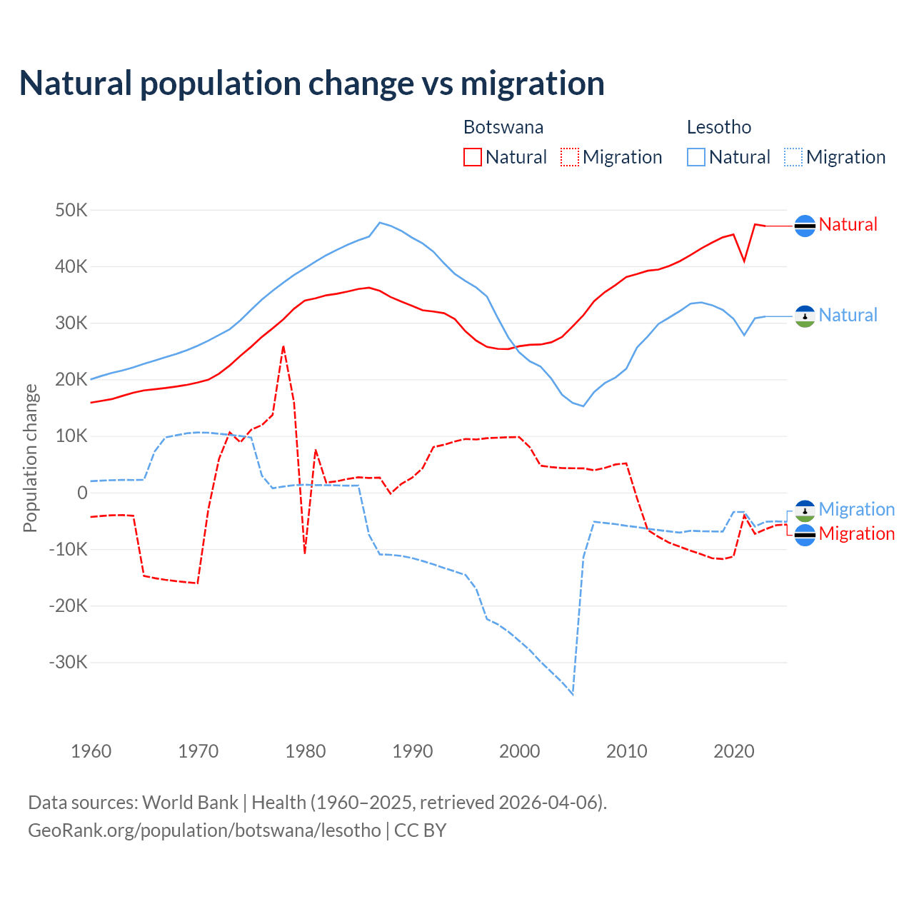 Over the last 10 years, 82.5% of the population change in Botswana is from natural causes (a gain of 436,373 people) and 17.5% is from migration (a loss of 92,293 people). In Lesotho 84.2% is from natural causes (a gain of 315,836 people) and 15.8% is from migration (a loss of 59,457 people).