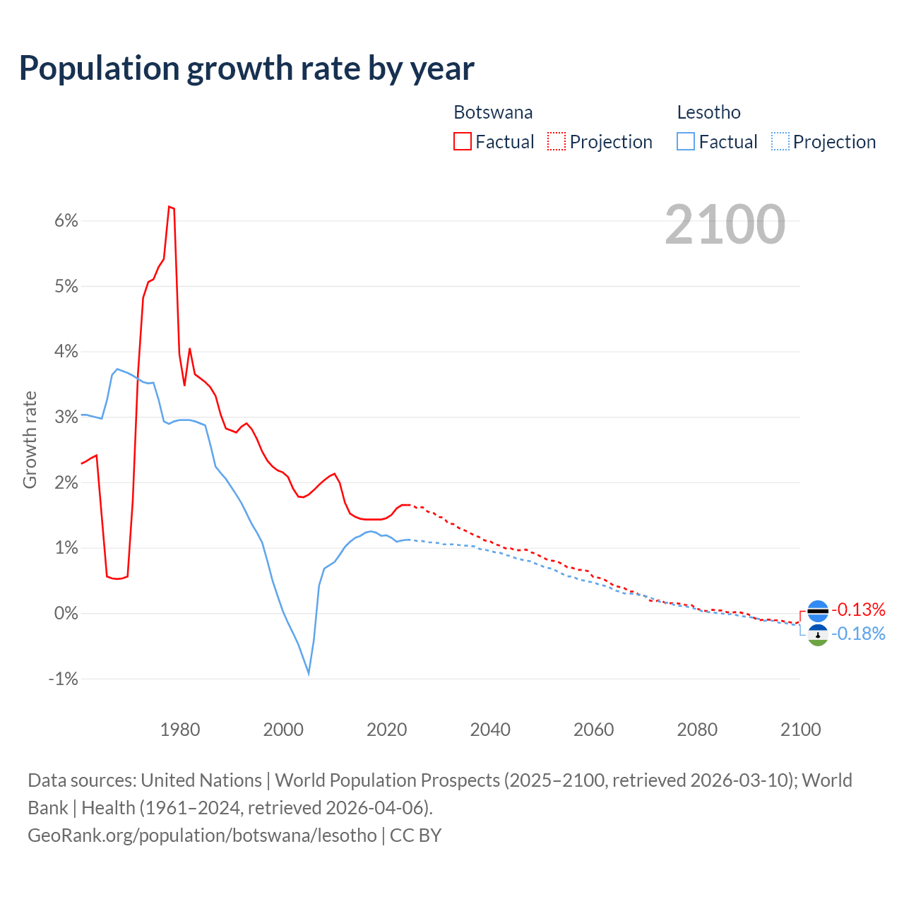 Botswana vs Lesotho: population by year and forecast