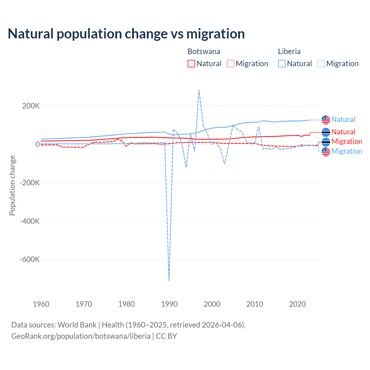 Over the last 10 years, 82.5% of the population change in Botswana is from natural causes (a gain of 436,373 people) and 17.5% is from migration (a loss of 92,293 people). In Liberia 87.7% is from natural causes (a gain of 1,202,387 people) and 12.3% is from migration (a loss of 168,316 people).