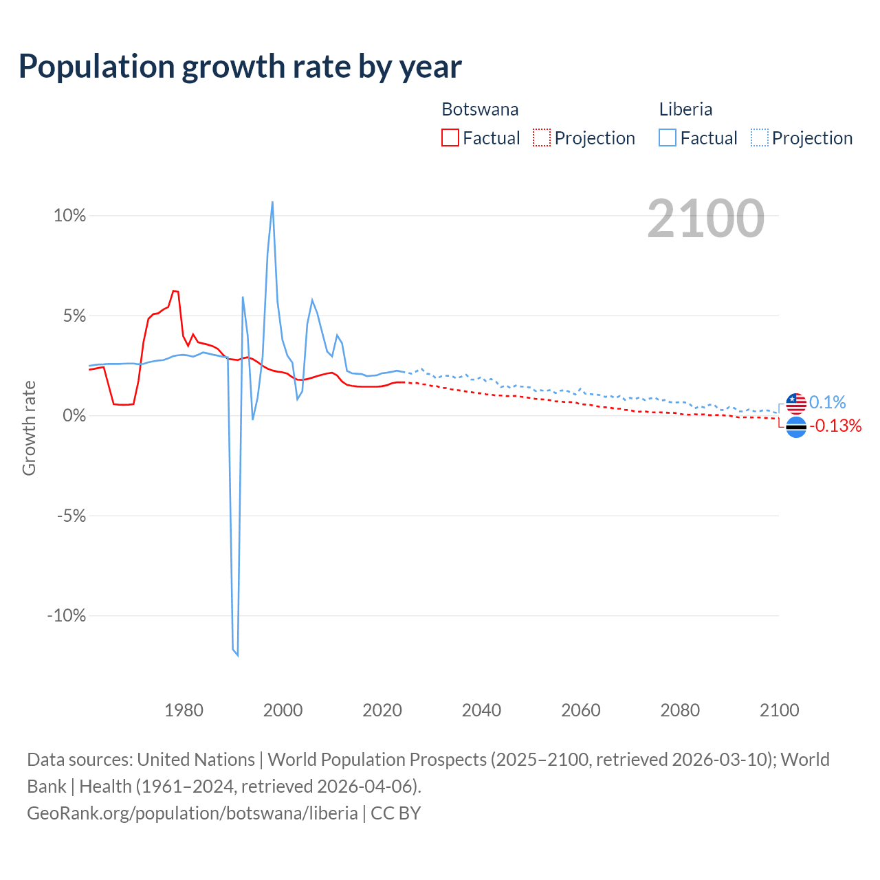 - For the last 10 years, Botswana has had an average growth rate of +1.5% per year vs +2.09% in Liberia.