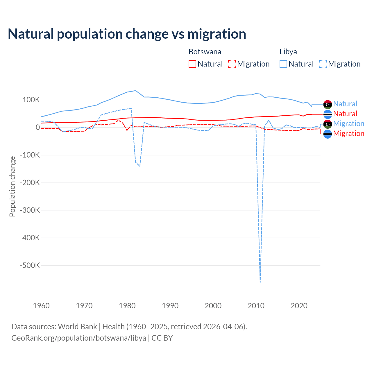 Over the last 10 years, 82.5% of the population change in Botswana is from natural causes (a gain of 436,373 people) and 17.5% is from migration (a loss of 92,293 people). In Libya 99.4% is from natural causes (a gain of 975,799 people) and 0.63% is from migration (a loss of 6,150 people).