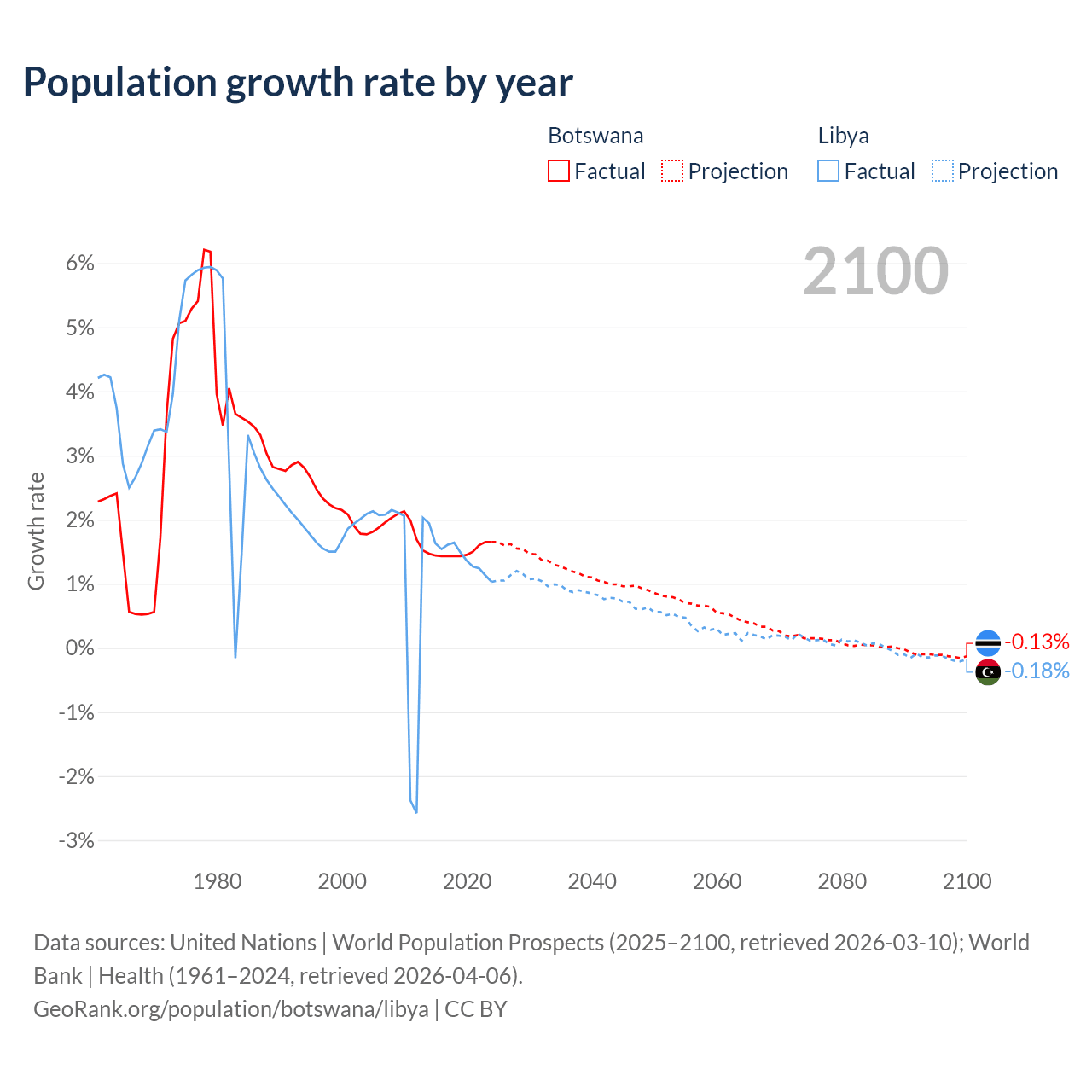 - For the last 10 years, Botswana has had an average growth rate of +1.5% per year vs +1.44% in Libya.