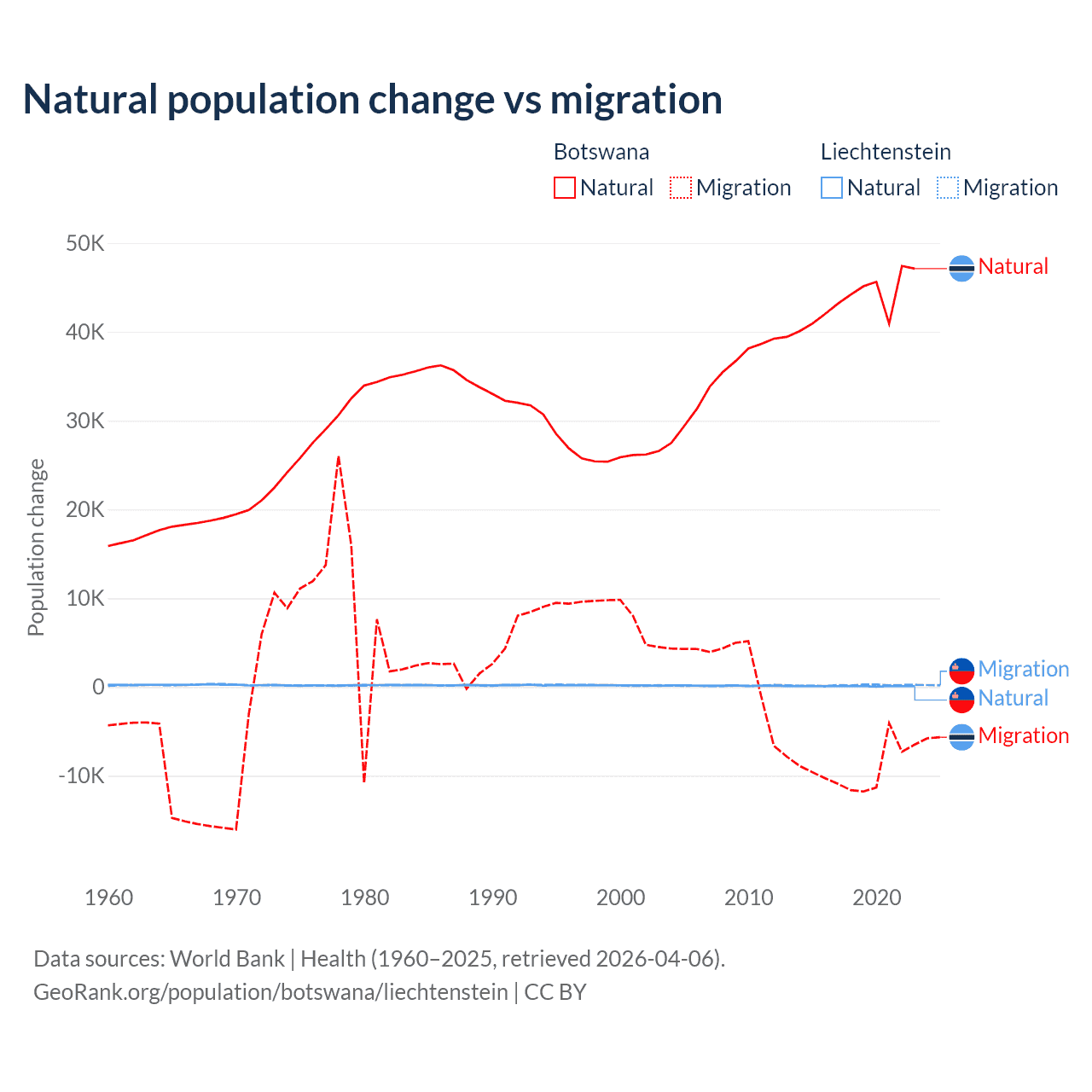 Over the last 10 years, 82.5% of the population change in Botswana is from natural causes (a gain of 436,373 people) and 17.5% is from migration (a loss of 92,293 people). In Liechtenstein 32.4% is from natural causes (a gain of 883 people) and 67.6% is from migration (a gain of 1,843 people).
