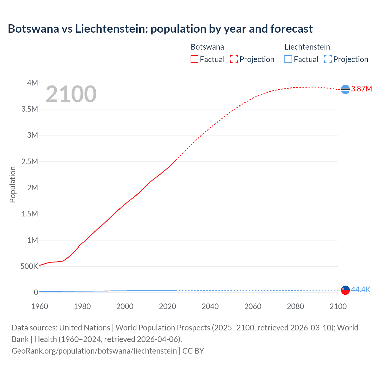 The latest officially reported population of Botswana was 2,521,139 in 2024 vs 40,450 people in Liechtenstein in 2024. In 2026, based on the adjusted UN estimation, the current Botswana's population is 2,615,162 people compared to 41,038 in Liechtenstein.