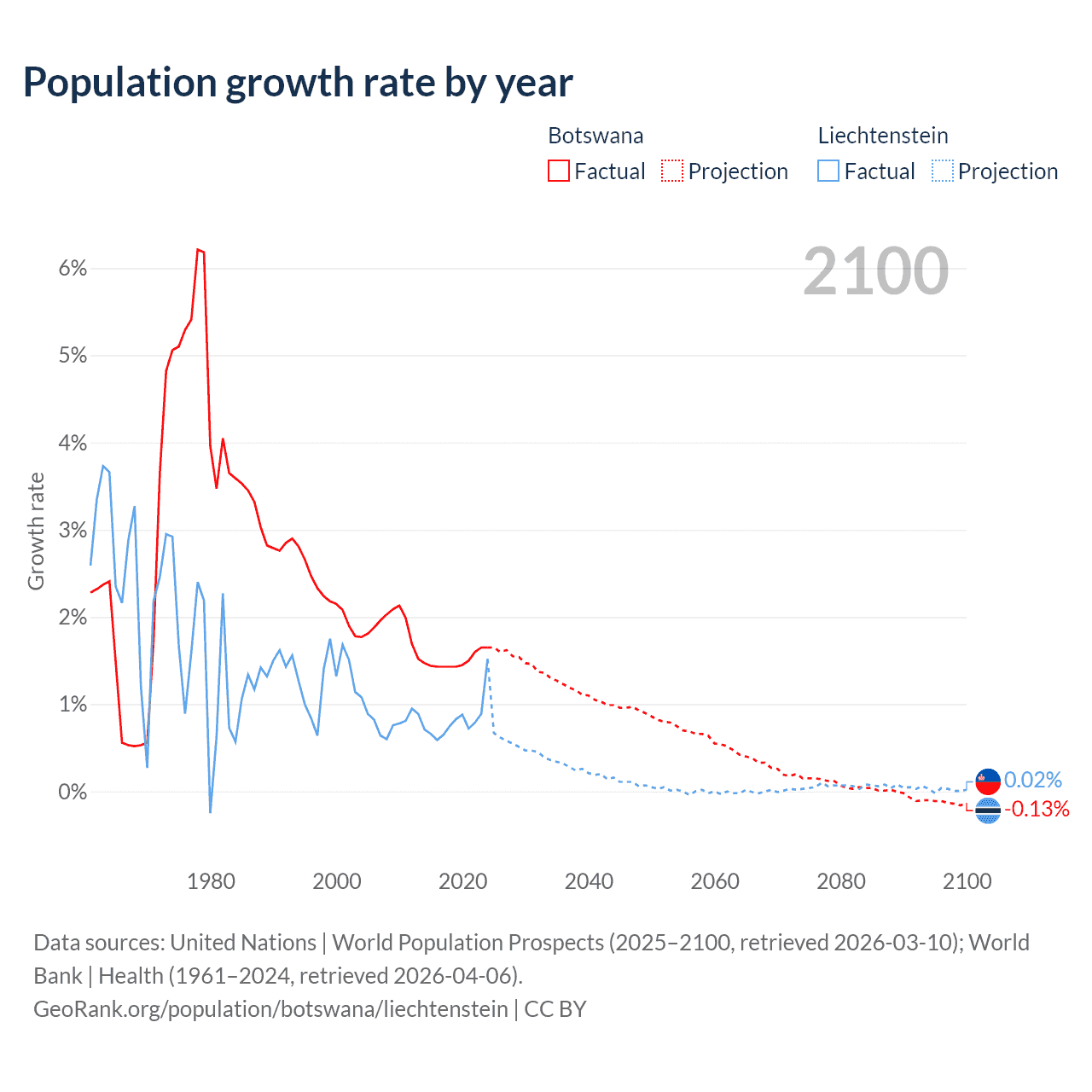 - For the last 10 years, Botswana has had an average growth rate of +1.5% per year vs +0.82% in Liechtenstein.