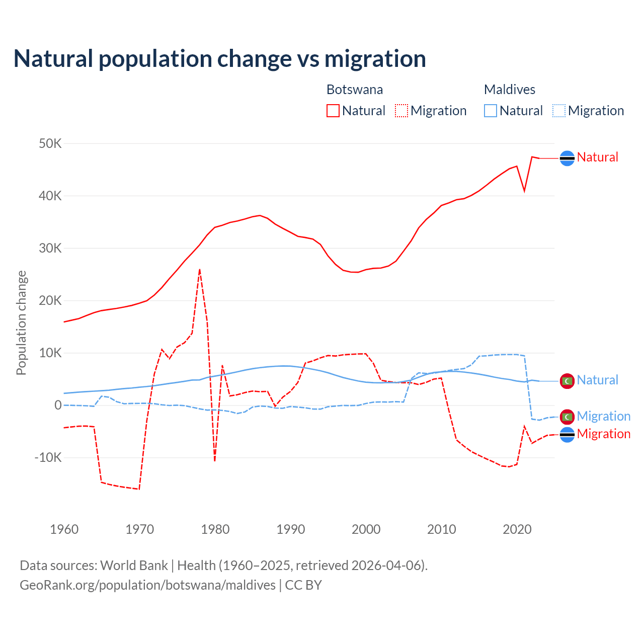 Over the last 10 years, 82.5% of the population change in Botswana is from natural causes (a gain of 436,373 people) and 17.5% is from migration (a loss of 92,293 people). In Maldives 42.7% is from natural causes (a gain of 51,342 people) and 57.3% is from migration (a gain of 68,788 people).