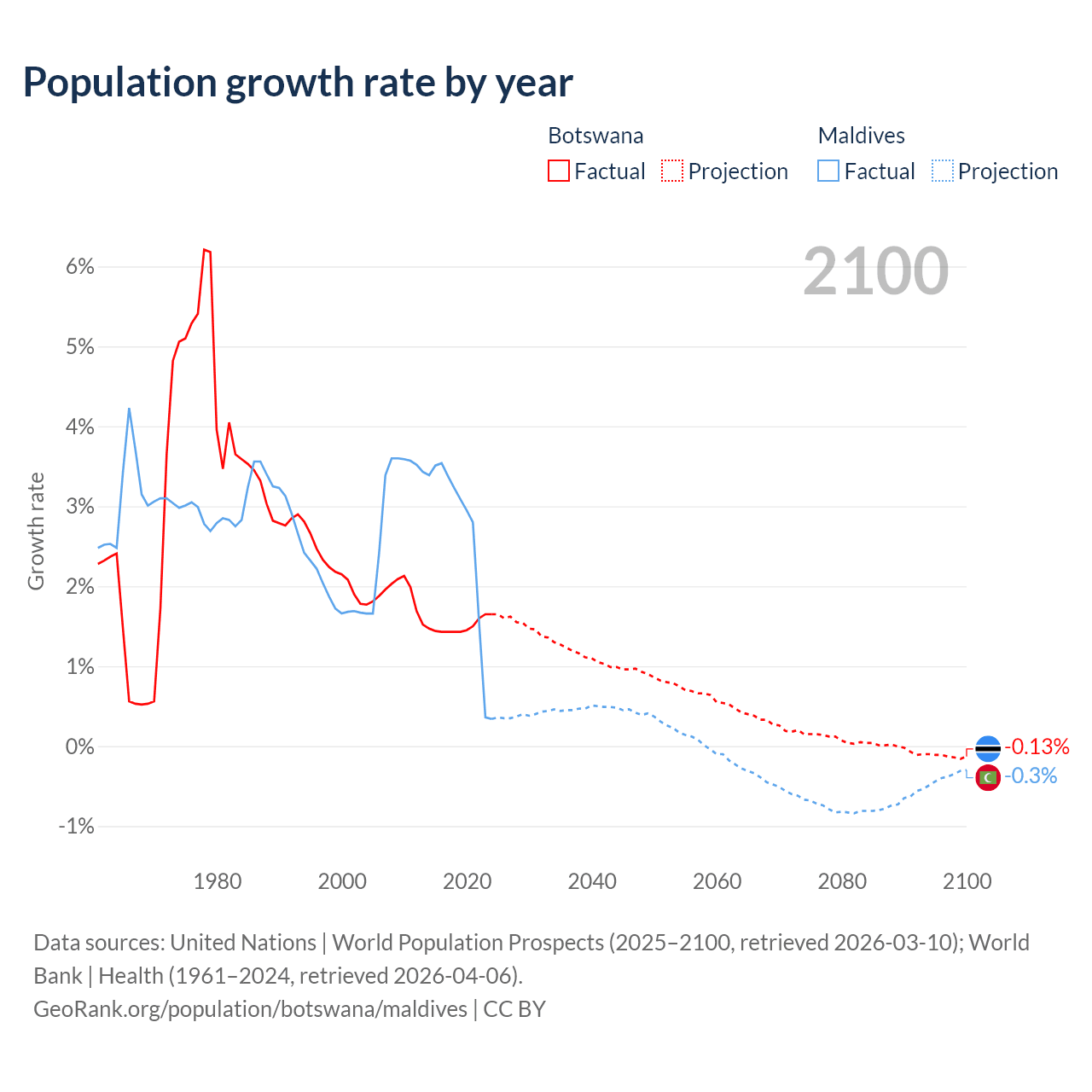 - For the last 10 years, Botswana has had an average growth rate of +1.5% per year vs +2.56% in Maldives.