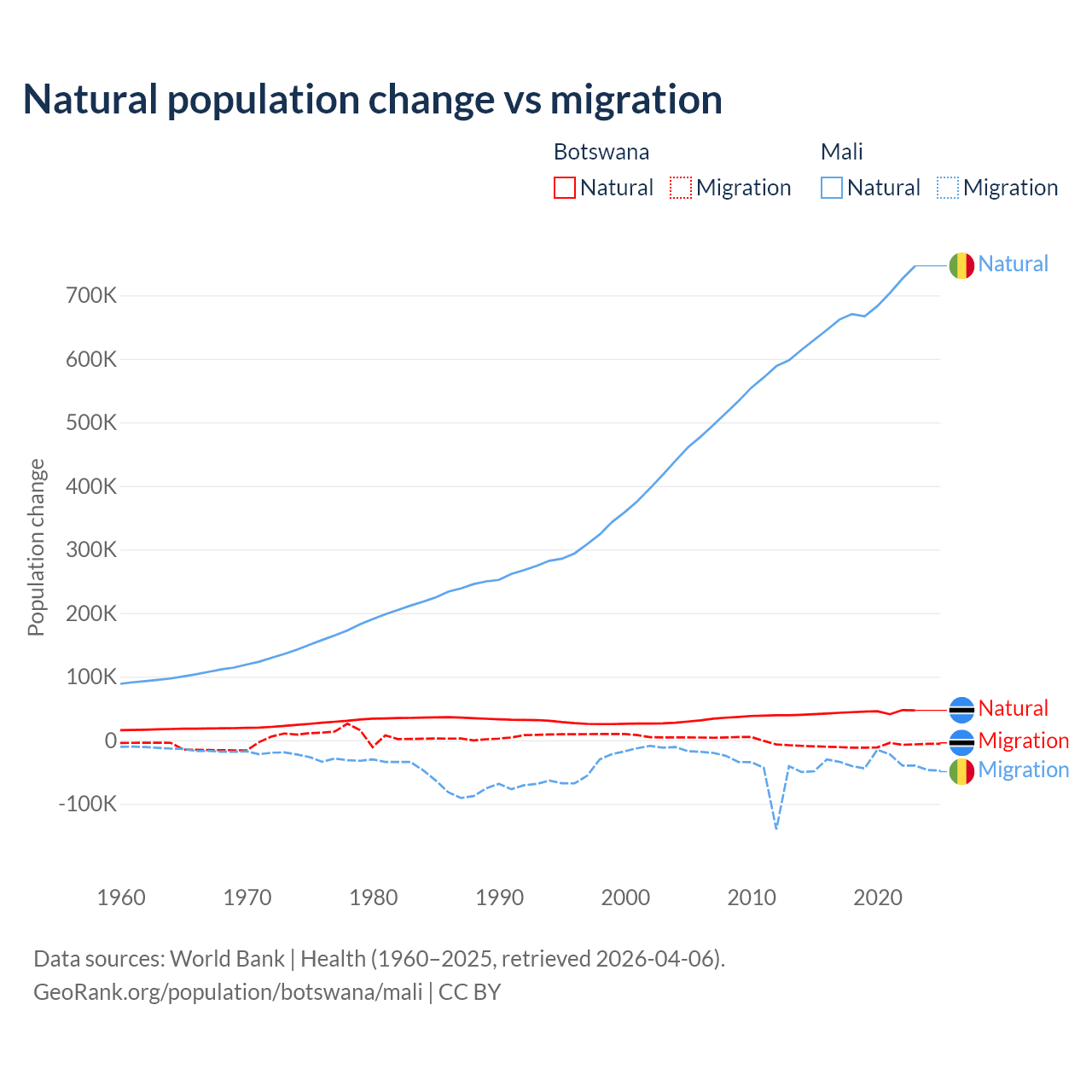 Over the last 10 years, 82.5% of the population change in Botswana is from natural causes (a gain of 436,373 people) and 17.5% is from migration (a loss of 92,293 people). In Mali 94.9% is from natural causes (a gain of 6,749,473 people) and 5.13% is from migration (a loss of 365,292 people).