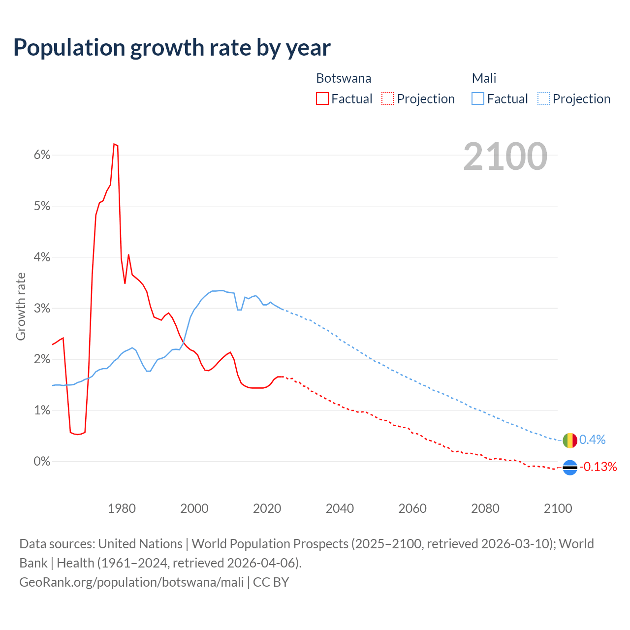 - For the last 10 years, Botswana has had an average growth rate of +1.5% per year vs +3.12% in Mali.