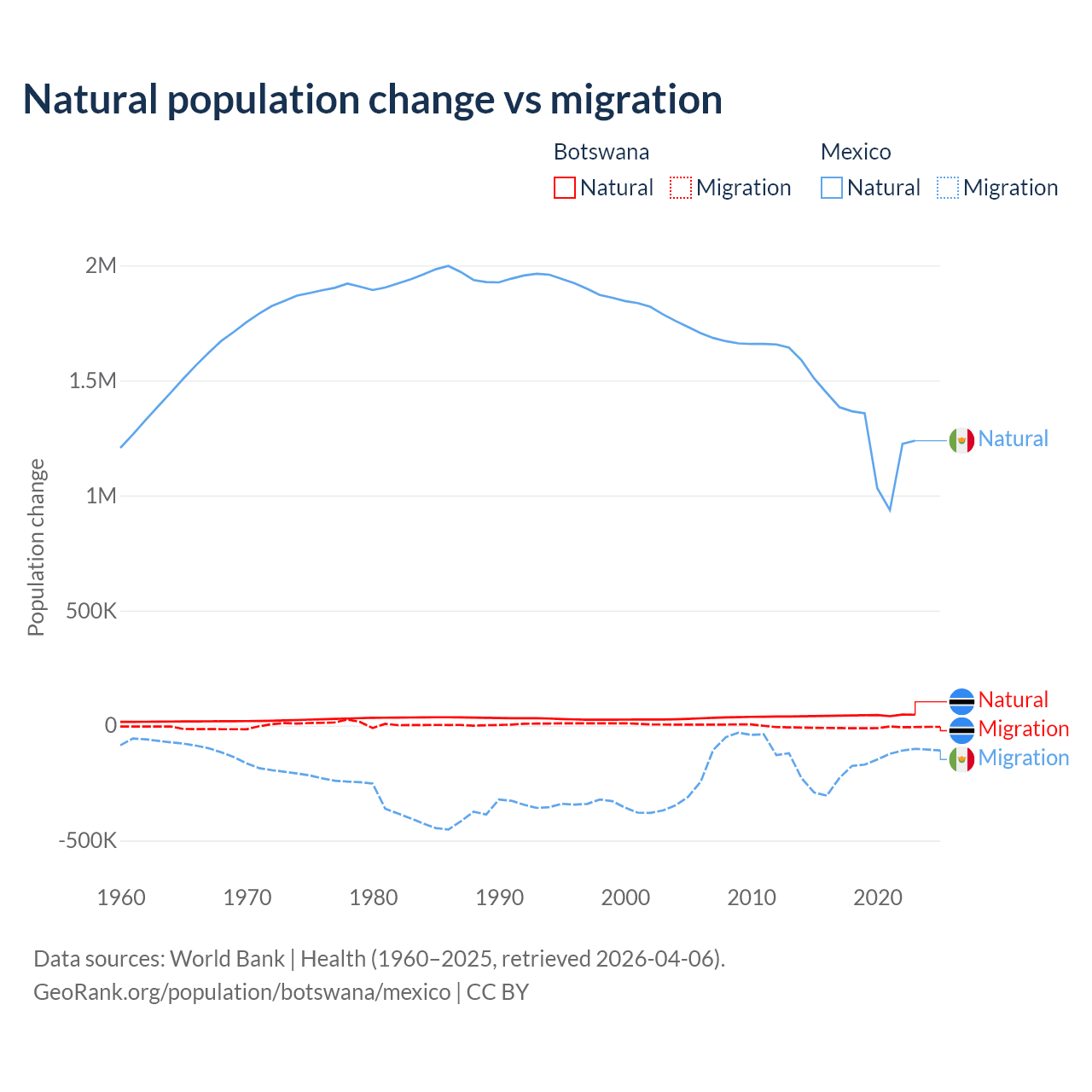 Over the last 10 years, 82.5% of the population change in Botswana is from natural causes (a gain of 436,373 people) and 17.5% is from migration (a loss of 92,293 people). In Mexico 87.5% is from natural causes (a gain of 13,080,136 people) and 12.5% is from migration (a loss of 1,876,544 people).
