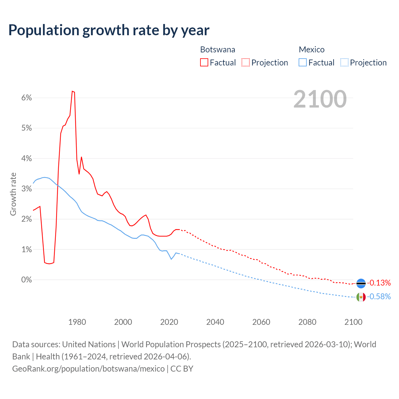- For the last 10 years, Botswana has had an average growth rate of +1.5% per year vs +0.92% in Mexico.