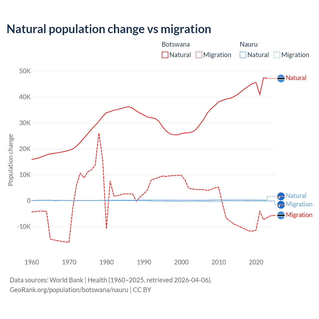 Over the last 10 years, 82.5% of the population change in Botswana is from natural causes (a gain of 436,373 people) and 17.5% is from migration (a loss of 92,293 people). In Nauru 66.2% is from natural causes (a gain of 2,590 people) and 33.8% is from migration (a loss of 1,320 people).