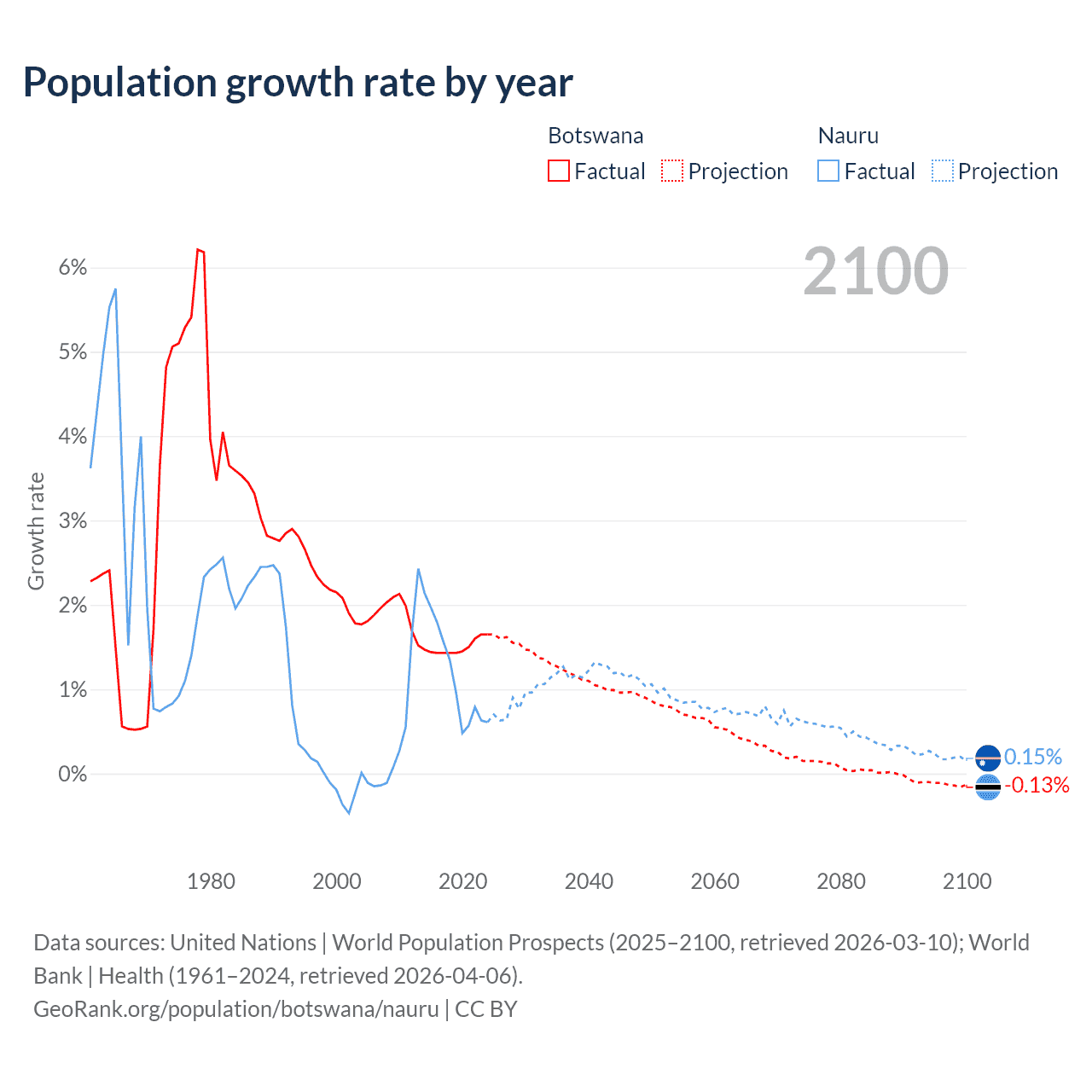 - For the last 10 years, Botswana has had an average growth rate of +1.5% per year vs +1.17% in Nauru.