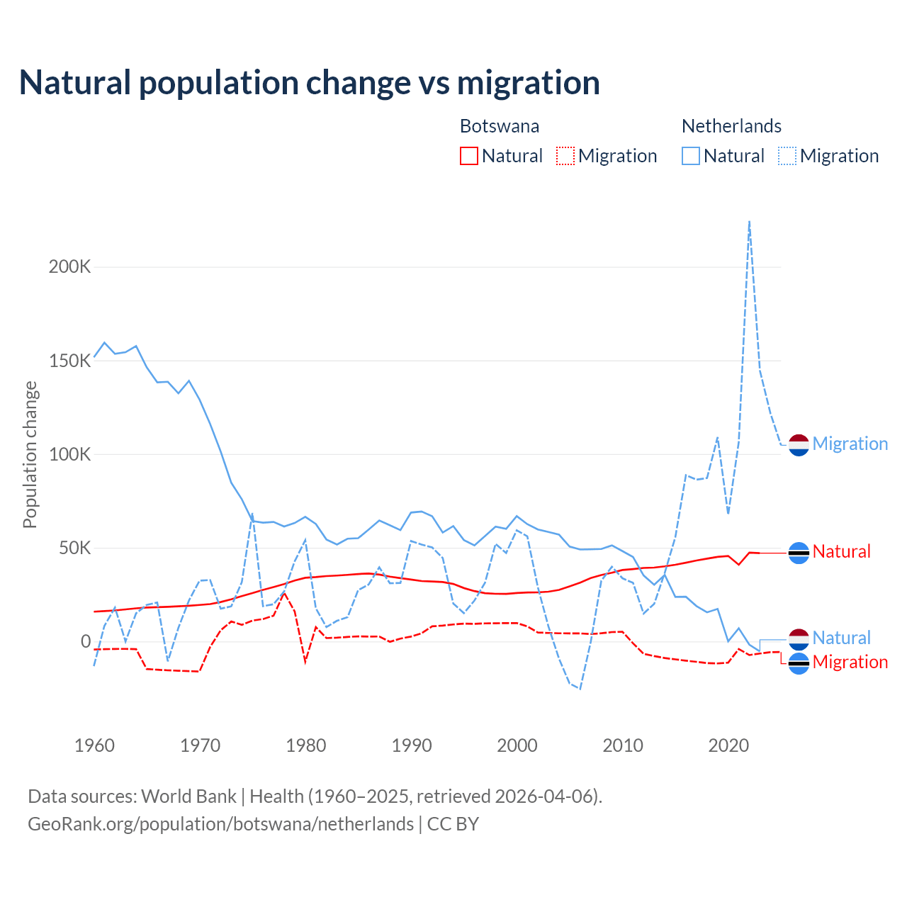 Over the last 10 years, 82.5% of the population change in Botswana is from natural causes (a gain of 436,373 people) and 17.5% is from migration (a loss of 92,293 people). In the Netherlands 11.8% is from natural causes (a gain of 134,554 people) and 88.2% is from migration (a gain of 1,006,495 people).