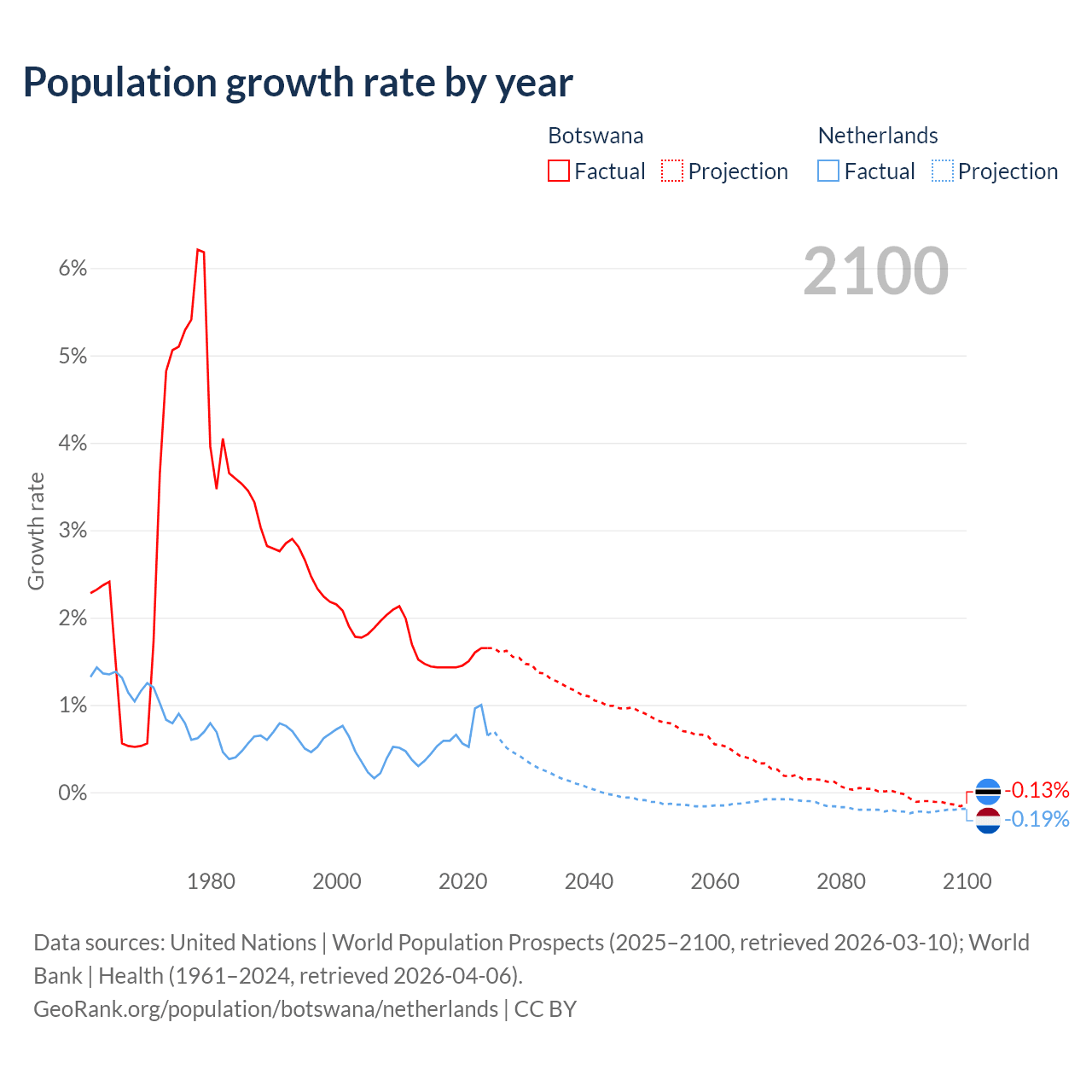 - For the last 10 years, Botswana has had an average growth rate of +1.5% per year vs +0.62% in the Netherlands.