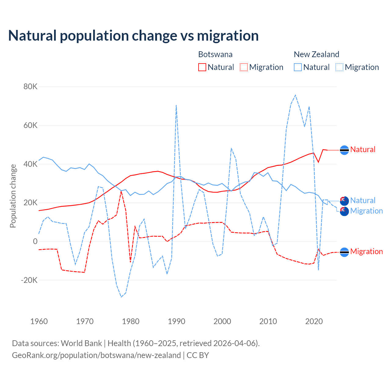 Over the last 10 years, 82.5% of the population change in Botswana is from natural causes (a gain of 436,373 people) and 17.5% is from migration (a loss of 92,293 people). In New Zealand 34.4% is from natural causes (a gain of 247,767 people) and 65.6% is from migration (a gain of 471,602 people).