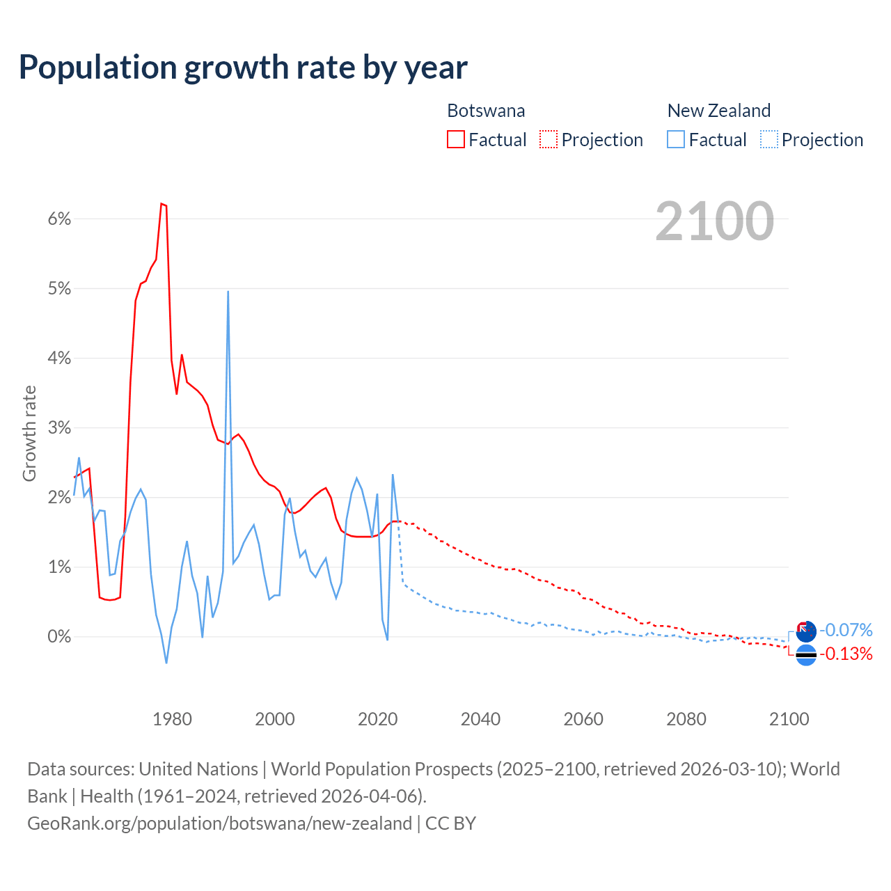 - For the last 10 years, Botswana has had an average growth rate of +1.5% per year vs +1.6% in New Zealand.