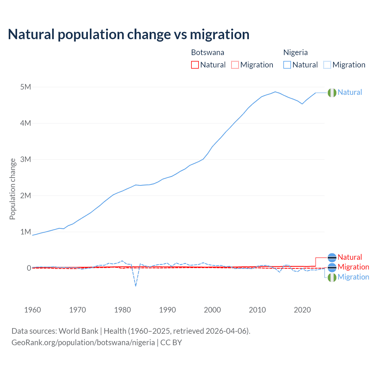 Over the last 10 years, 82.5% of the population change in Botswana is from natural causes (a gain of 436,373 people) and 17.5% is from migration (a loss of 92,293 people). In Nigeria 99.2% is from natural causes (a gain of 47,163,517 people) and 0.77% is from migration (a loss of 368,103 people).
