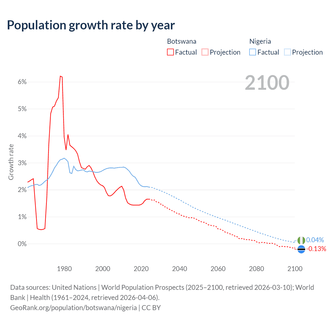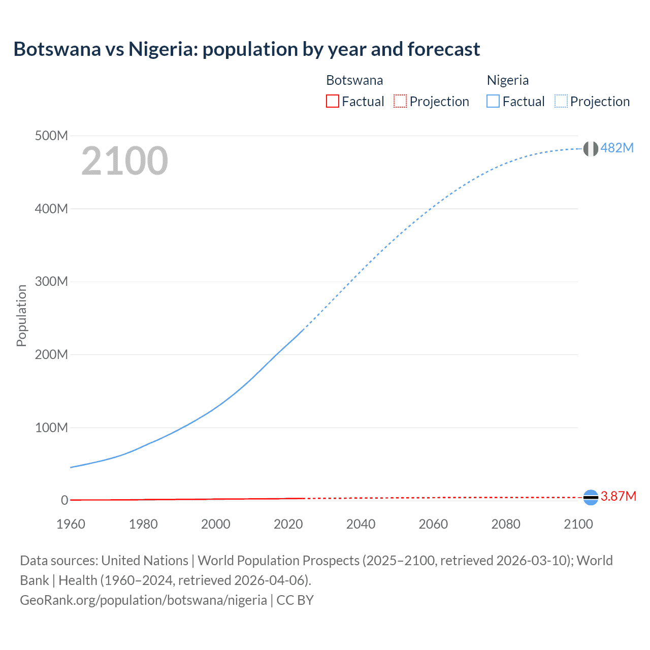 Botswana vs Nigeria: population by year and forecast