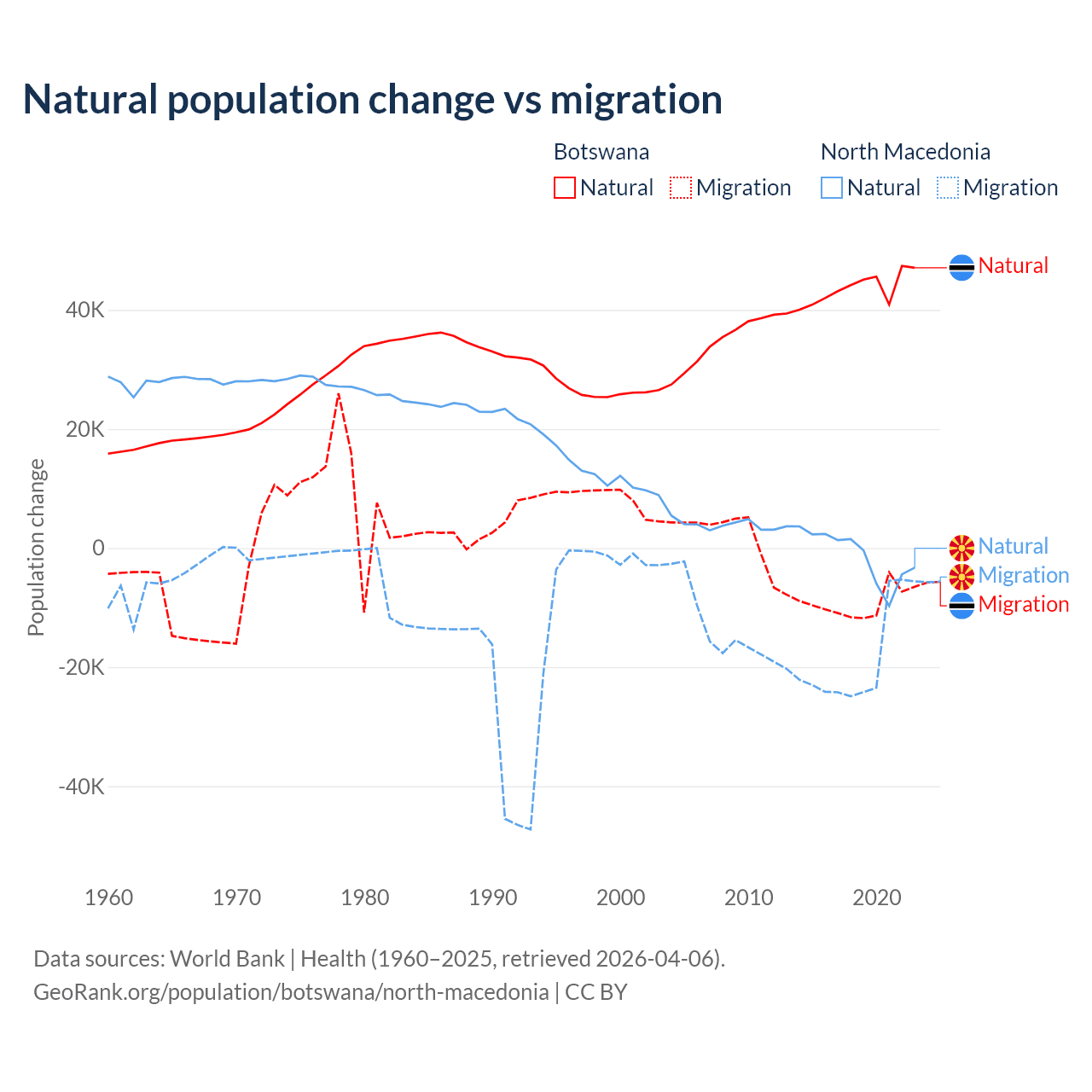 Over the last 10 years, 82.5% of the population change in Botswana is from natural causes (a gain of 436,373 people) and 17.5% is from migration (a loss of 92,293 people). In North Macedonia 6.45% is from natural causes (a loss of 12,585 people) and 93.5% is from migration (a loss of 182,429 people).