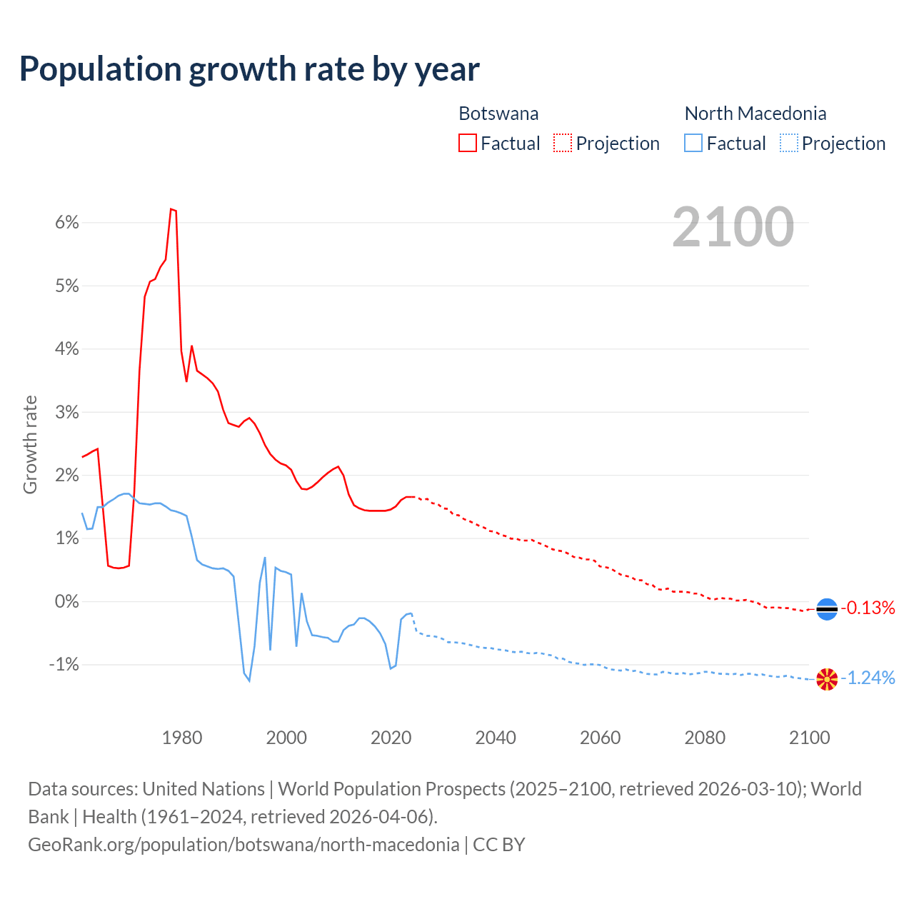 - For the last 10 years, Botswana has had an average growth rate of +1.5% per year vs -0.48% in North Macedonia.