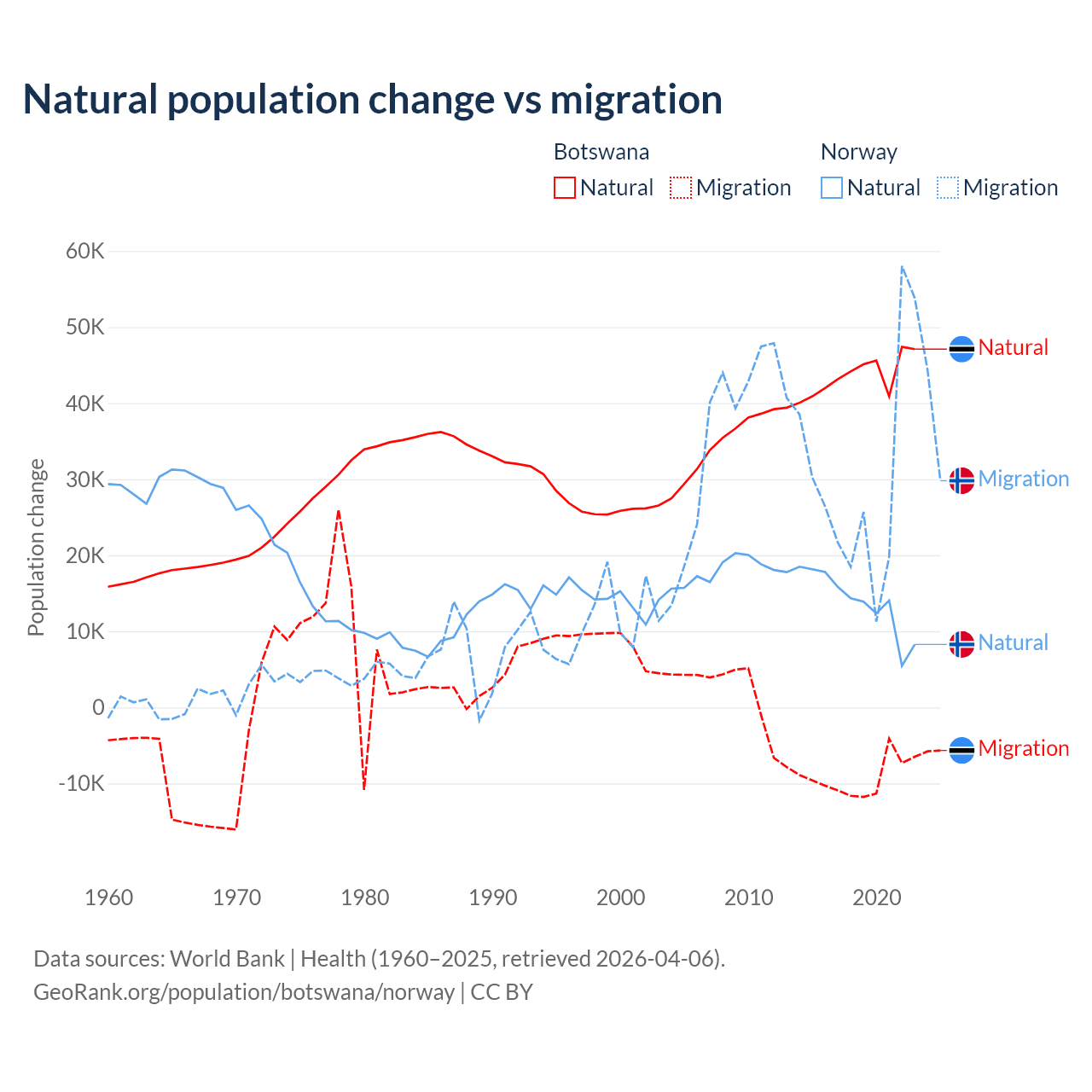 Over the last 10 years, 82.5% of the population change in Botswana is from natural causes (a gain of 436,373 people) and 17.5% is from migration (a loss of 92,293 people). In Norway 31.3% is from natural causes (a gain of 138,699 people) and 68.7% is from migration (a gain of 303,945 people).