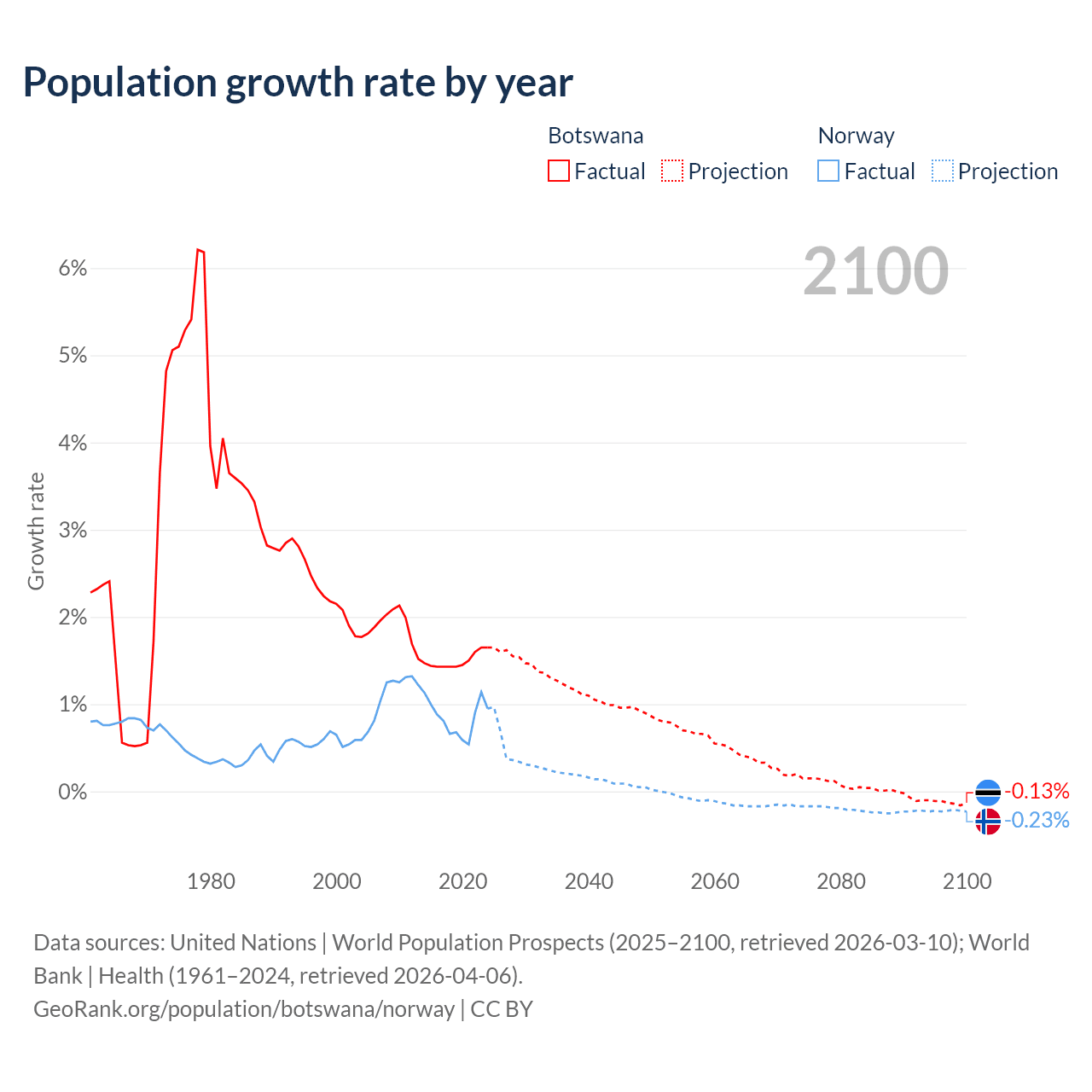 - For the last 10 years, Botswana has had an average growth rate of +1.5% per year vs +0.85% in Norway.