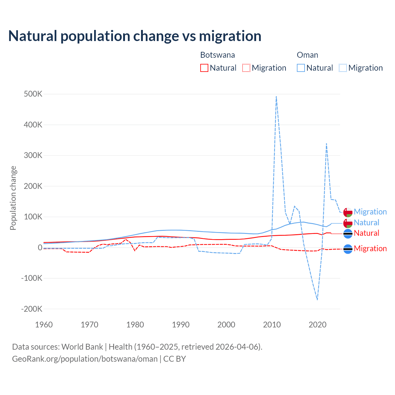 Over the last 10 years, 82.5% of the population change in Botswana is from natural causes (a gain of 436,373 people) and 17.5% is from migration (a loss of 92,293 people). In Oman 61.6% is from natural causes (a gain of 763,049 people) and 38.4% is from migration (a gain of 475,565 people).