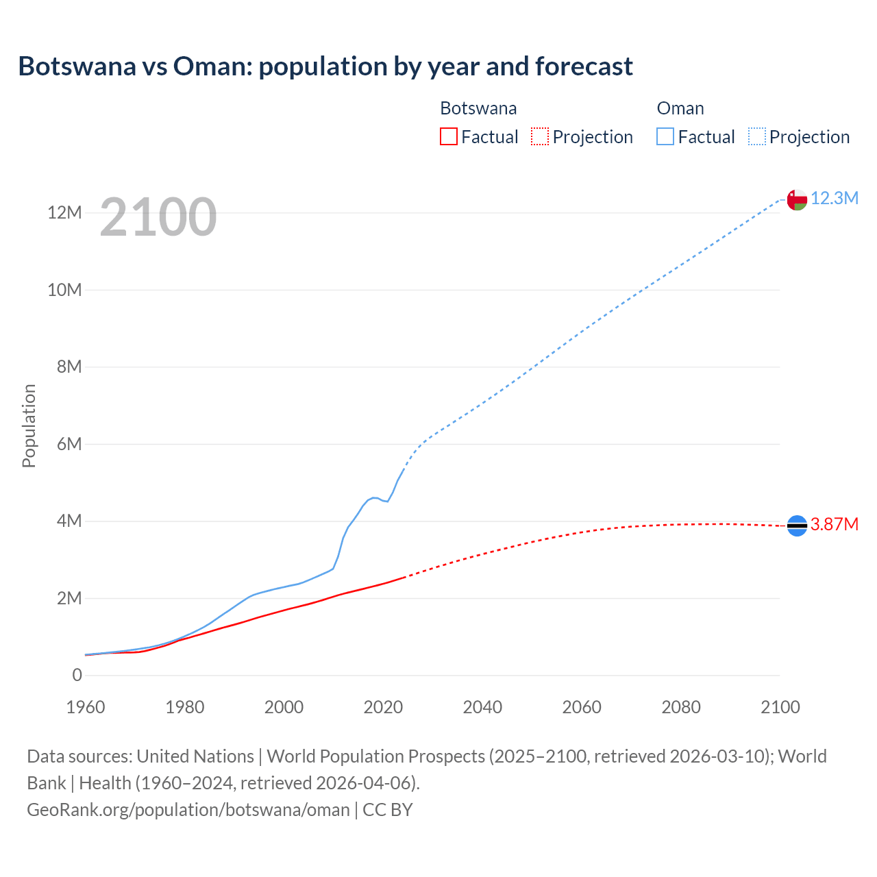 Botswana vs Oman: population by year and forecast