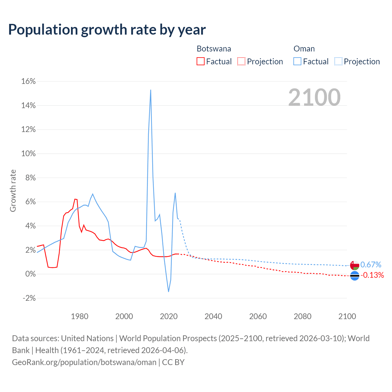 - For the last 10 years, Botswana has had an average growth rate of +1.5% per year vs +2.99% in Oman.