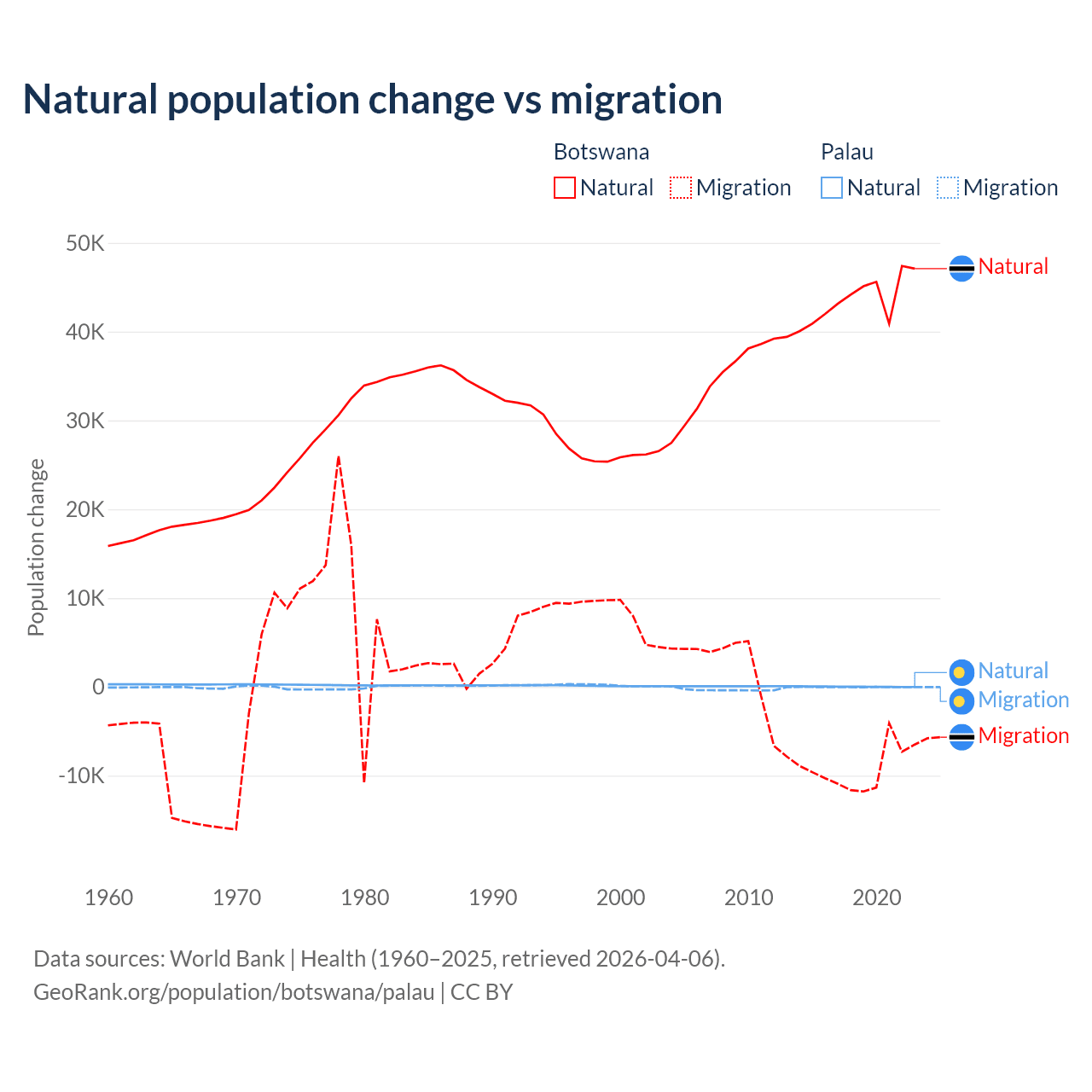 Over the last 10 years, 82.5% of the population change in Botswana is from natural causes (a gain of 436,373 people) and 17.5% is from migration (a loss of 92,293 people). In Palau 53.8% is from natural causes (a gain of 264 people) and 46.2% is from migration (a loss of 227 people).