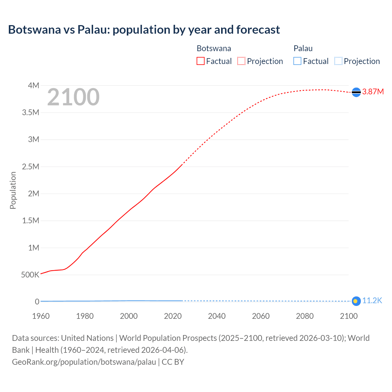The latest officially reported population of Botswana was 2,521,139 in 2024 vs 17,695 people in Palau in 2024. In 2026, based on the adjusted UN estimation, the current Botswana's population is 2,615,162 people compared to 17,629 in Palau.