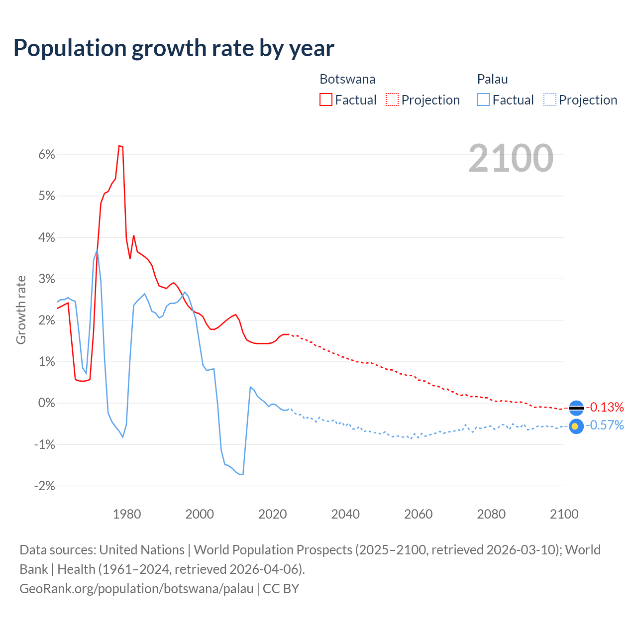 - For the last 10 years, Botswana has had an average growth rate of +1.5% per year vs +0.02% in Palau.