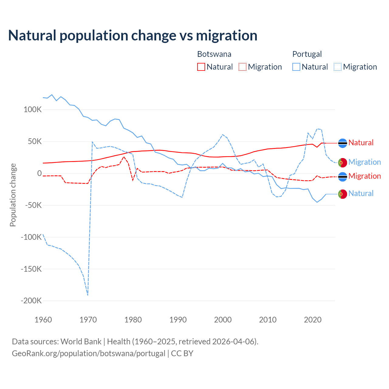Over the last 10 years, 82.5% of the population change in Botswana is from natural causes (a gain of 436,373 people) and 17.5% is from migration (a loss of 92,293 people). In Portugal 51% is from natural causes (a loss of 302,748 people) and 49% is from migration (a gain of 290,554 people).