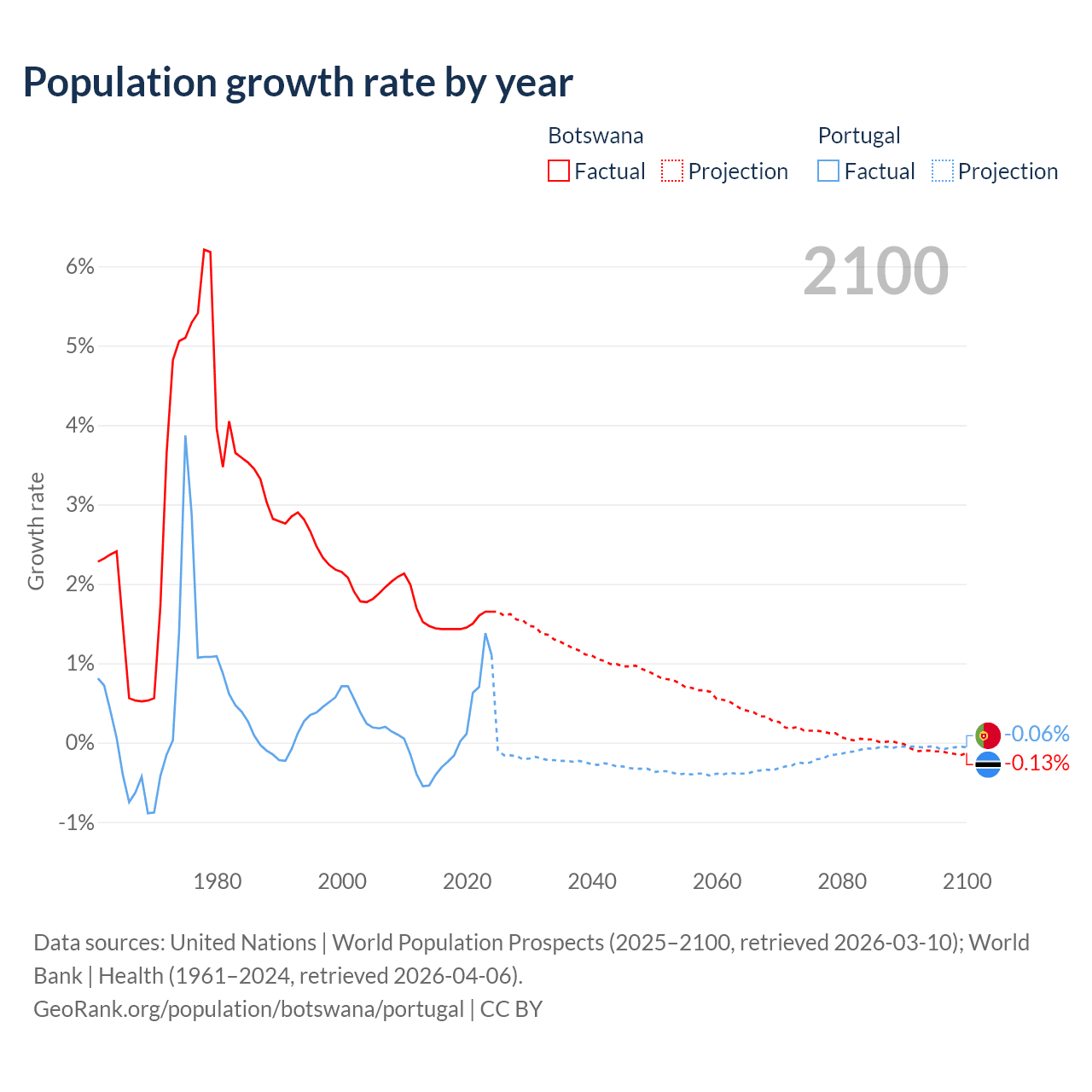 - For the last 10 years, Botswana has had an average growth rate of +1.5% per year vs +0.21% in Portugal.