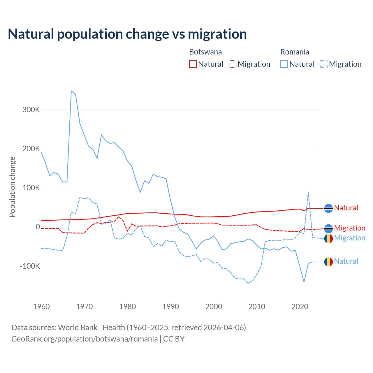 Over the last 10 years, 82.5% of the population change in Botswana is from natural causes (a gain of 436,373 people) and 17.5% is from migration (a loss of 92,293 people). In Romania 82% is from natural causes (a loss of 766,295 people) and 18% is from migration (a loss of 167,917 people).