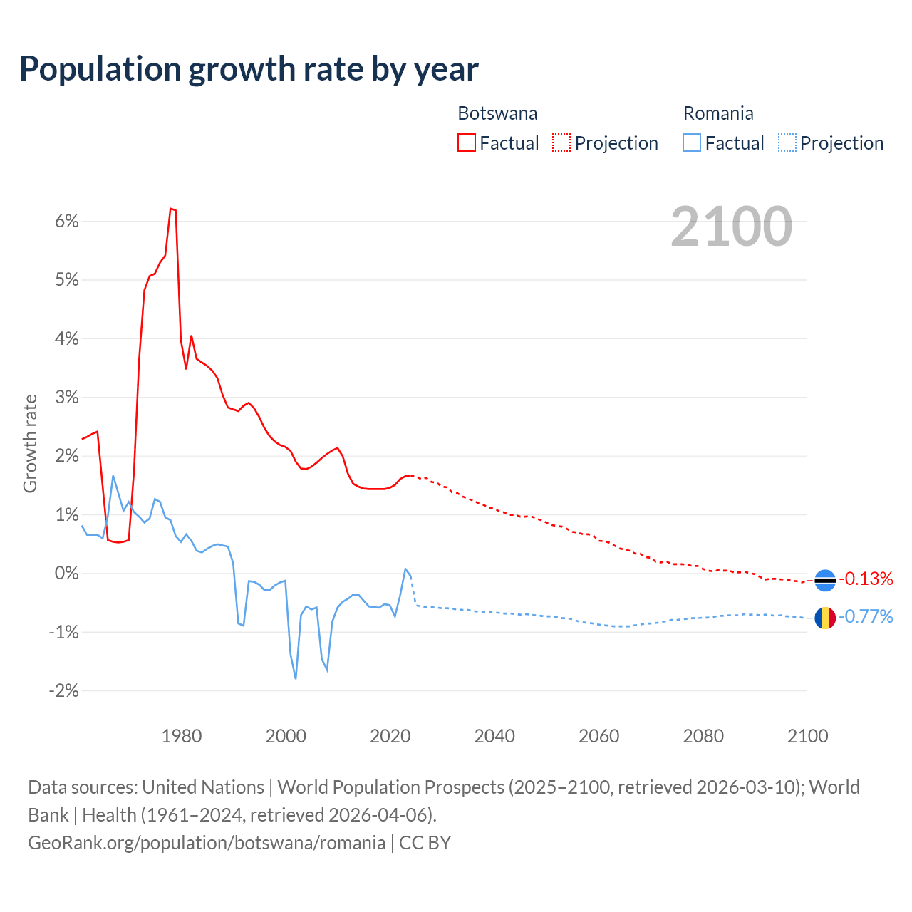 - For the last 10 years, Botswana has had an average growth rate of +1.5% per year vs -0.43% in Romania.