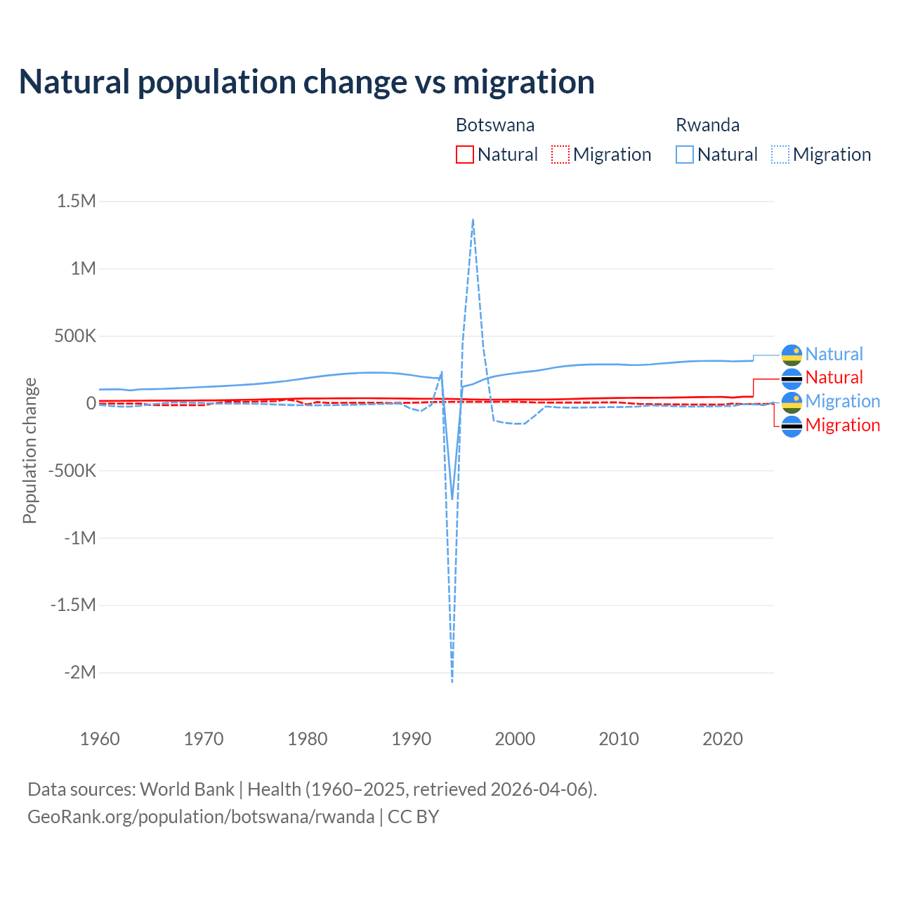 Over the last 10 years, 82.5% of the population change in Botswana is from natural causes (a gain of 436,373 people) and 17.5% is from migration (a loss of 92,293 people). In Rwanda 93.8% is from natural causes (a gain of 3,081,296 people) and 6.18% is from migration (a loss of 203,035 people).