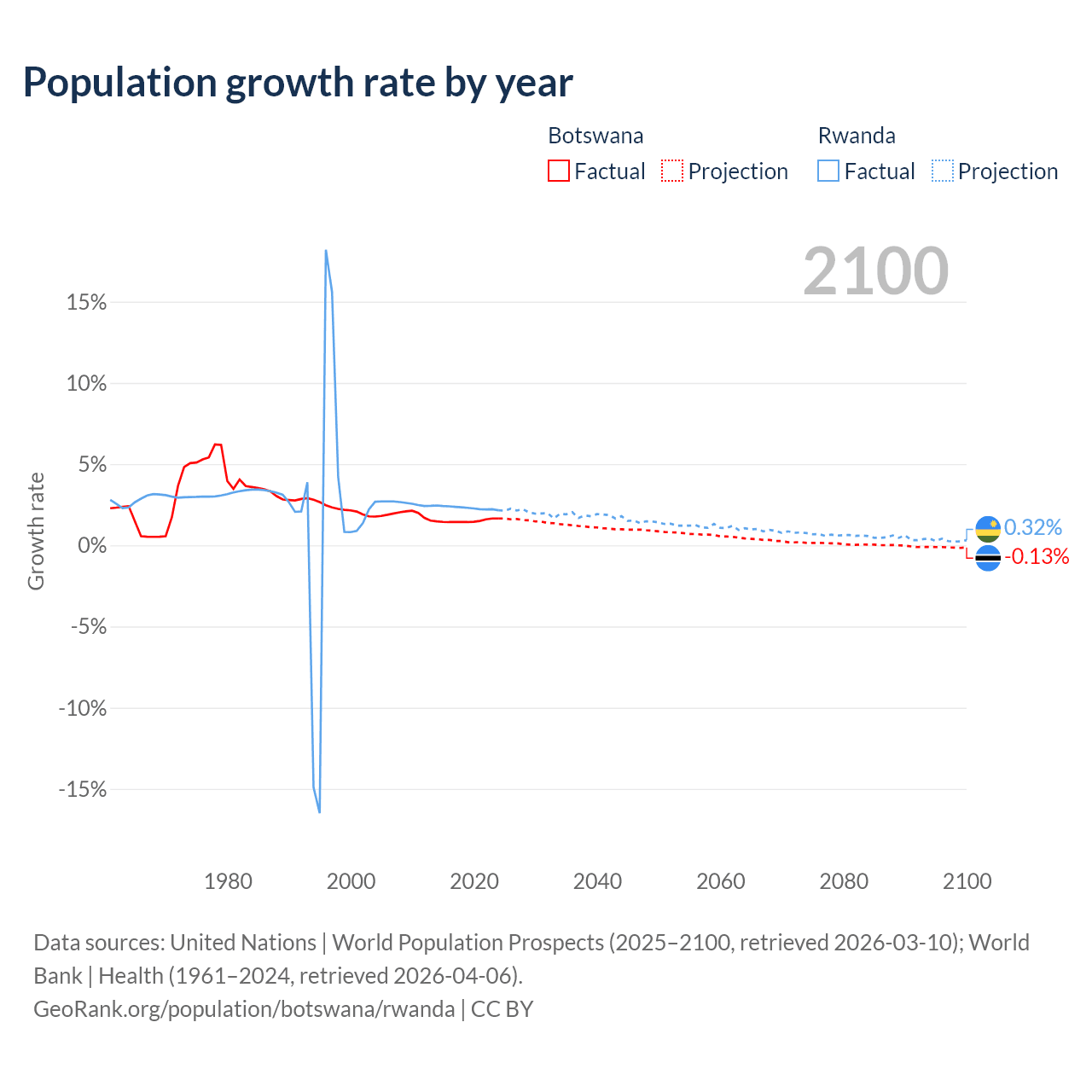 - For the last 10 years, Botswana has had an average growth rate of +1.5% per year vs +2.31% in Rwanda.