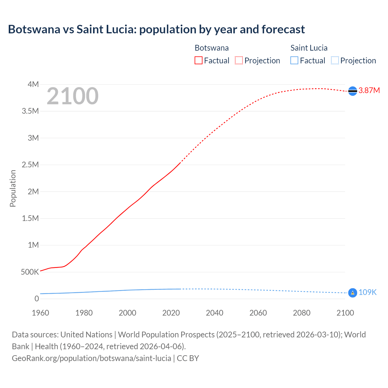 - Botswana's population is 14.5 times bigger than Saint Lucia's.