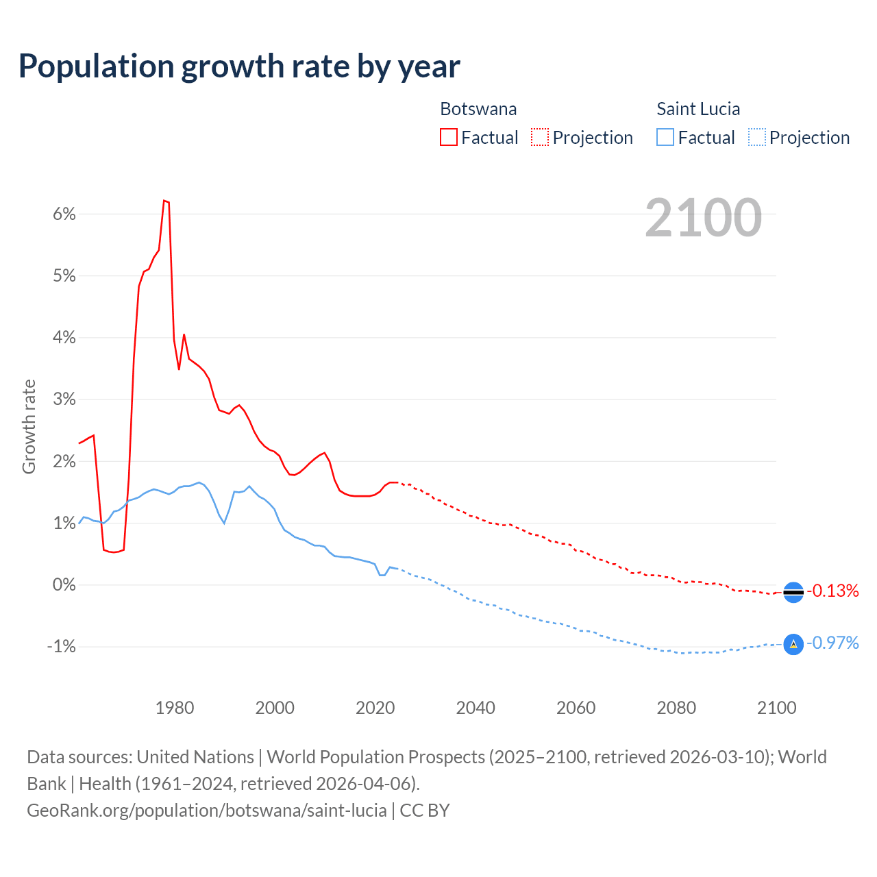 - For the last 10 years, Botswana has had an average growth rate of +1.5% per year vs +0.33% in Saint Lucia.