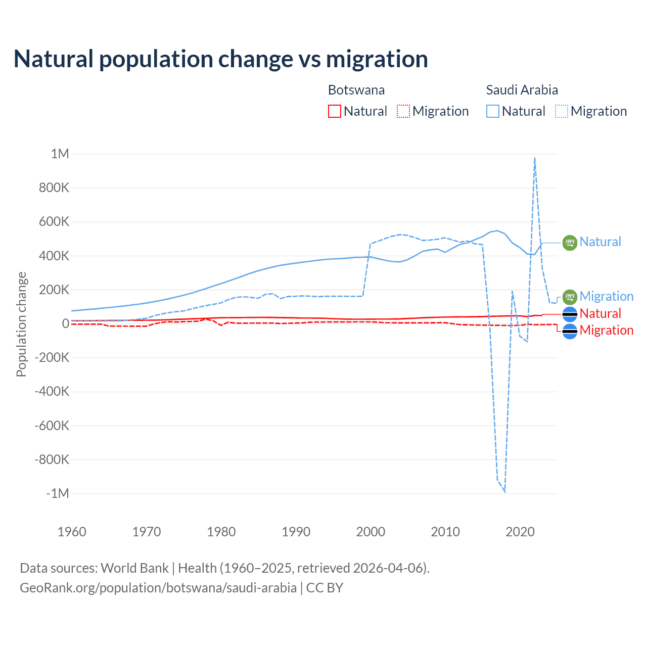 Over the last 10 years, 82.5% of the population change in Botswana is from natural causes (a gain of 436,373 people) and 17.5% is from migration (a loss of 92,293 people). In Saudi Arabia 93.9% is from natural causes (a gain of 4,829,562 people) and 6.05% is from migration (a gain of 311,209 people).