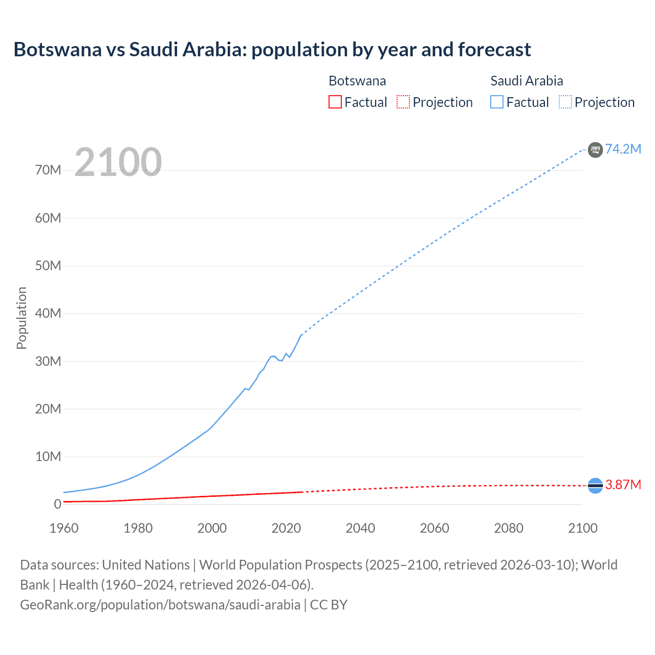 Botswana vs Saudi Arabia: population by year and forecast